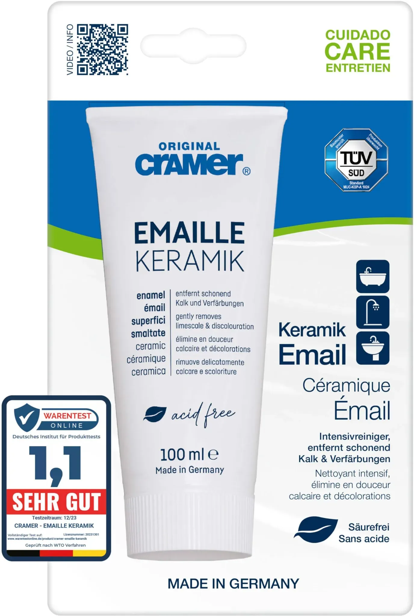 Cramer bietet verschiedene Produkte an, darunter den Cramer Email Keramik Intensivreiniger (für starke Verschmutzungen und stumpf gewordene Oberflächen) und die Cramer Ceramic and Enamel Polish (eine säurefreie Politur für die schonende Reinigung und Pflege) sowie den Cramer Bath and Kitchen Stain Eraser (zur Entfernung von hartnäckigen Ablagerungen ohne Kratzer)[1][2][4]. Die Marke Cramer ist in diesem Bereich sehr bekannt und gilt als Profi-Marke für die Reinigung und Pflege von Sanitärkeramik und Emaille. Produkte wie Email-Star (jetzt auch als EMAIL Keramic bezeichnet) sind speziell für die Entfernung von Kratzern und zur Politur entwickelt worden[5][9]. Die Produkte liegen meist im Bereich von etwa 10 bis 30 Euro pro 100 ml bis 150 ml Packung, je nach Produktart und Händler. Zum Beispiel kostet der Cramer Bath and Kitchen Stain Eraser zwischen 14,95 und 29,00 USD (entspricht ca. 15-30 Euro)[4]. Intensivreiniger und Polituren sind vergleichbar preislich angesiedelt. Für den Intensivreiniger wird eine Anwendung alle 3-4 Monate empfohlen, bei Bedarf auch öfter, da die Rezeptur schonend ist[2]. Zusammenfassend sollten Sie beim Kauf auf säurefreie, hautfreundliche und TÜV-geprüfte Produkte von Cramer achten, die speziell für keramische und emaillierte Oberflächen geeignet sind. Die Preise liegen meist zwischen 10 und 30 Euro. Die Marke Cramer ist in diesem Segment sehr beliebt und gilt als professionell und zuverlässig. Für eine gezielte Produktsuche können Sie z.B. nach folgenden Produkten im Meta-Preisvergleich suchen: