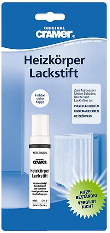 Kategorie: Farben & Lacke - Cramer - GTIN:4027316150201 - Für alle Heizkörpertypen: Perfekt geeignet für Badheizkörper, Flachheizkörper und Design-Heizkörper - die optimale Lösung für kleine Kratzer, Lackfehler und Beschädigungen. Ihre erste Wahl für schnelle und effektive Reparaturen - einfach anzuwenden und sofortige Ergebnisse. Dauerhaft und Vielseitig: Ideal für Metall, emaillierte und pulverbeschichtete Flächen - für all Ihre Reparaturbedürfnisse. Farbtongetreue Ausbesserungen ohne zu vergilbung - für langanhaltende Ergebnisse! Schnell & einfach in der Handhabung: Reparaturstift gut schütteln, auftragen und präzise arbeiten - Füllmasse und Decklack in einem. Die hochwertige Pinselspitze ermöglicht einen kinderleichte Reparatur ohne großen Aufwand. Hitzebeständig bis 90 C. Vertrauen Sie auf TüV-geprüfte Qualität! Schutz gegen Rost und Korrosion: Unser Reparatur-Lack bietet zuverlässigen Schutz. Langanhaltende Resultate: Farbbeständig und vergilbt nicht - für dauerhafte Ergebnisse, die überzeugen!. Wichtige Hinweise und Einschränkungen: Nicht geeignet bei Rissen oder zum Abdichten von Heizkörpern. Nicht lebensmittelecht - nicht verwenden für Küchenherde, Kochgeschirr oder bei Lebensmittelkontakt. Erfahrung zählt: Original Cramer - Ihr Experte seit 1972. Profitieren Sie von über 5 n Expertise in der Entwicklung innovativer Produkte zur Pflege, Reparatur und zum Schutz von Oberflächen. Setzen Sie auf Qualität: Vertrauen Sie auf unsere Kompetenz - denn Ihre Zufriedenheit ... ![]() ![]() Cramer Heizkörper Lackstift 12 ml - hitzebeständiger Speziallack für schnelle Ausbesserungen. Ideal für Kratzer und Lackfehler an Heizkörpern, Emaille- und Metalloberflächen