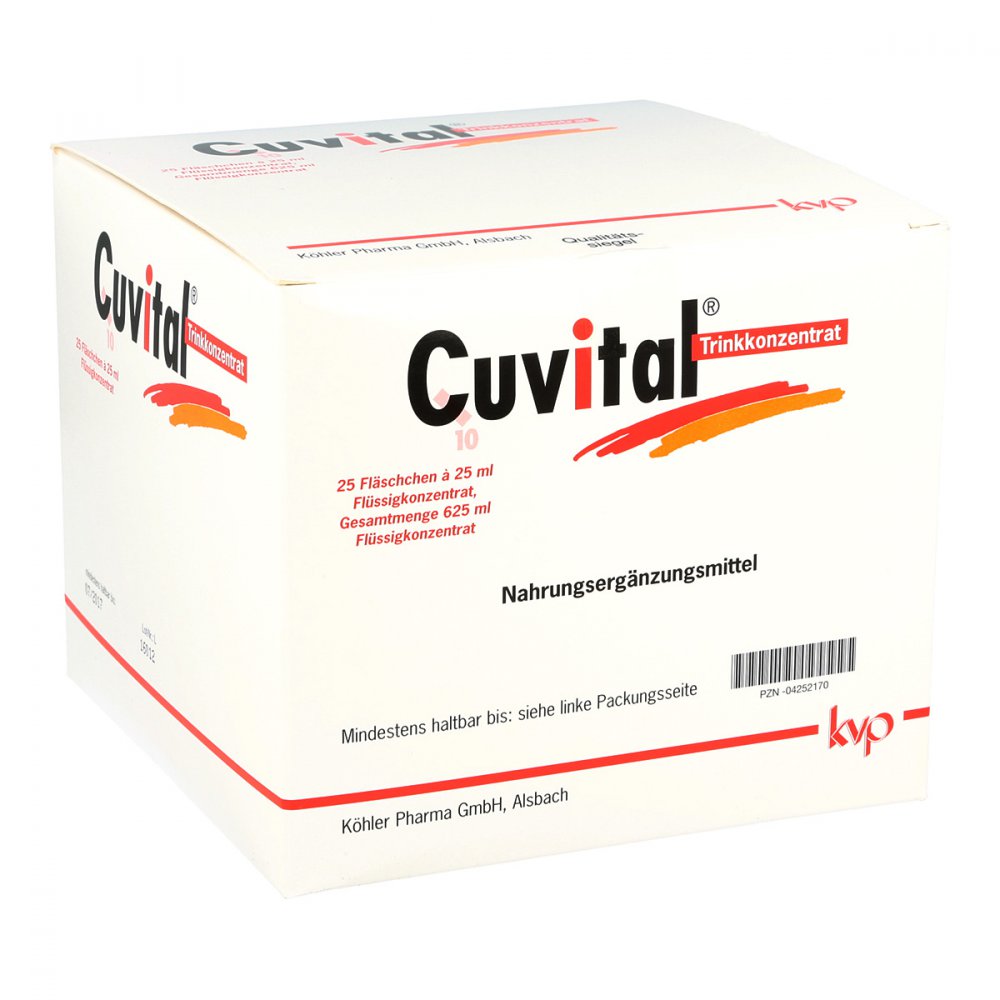 Verfügbarkeit: ca. 1-2 Werktage - 58.66 € / 1 l - Kategorie: Arzneimittel - Köhler Pharma - GTIN:4150042521707 - PZN:04252170 - 04252170: Köhler Pharma GmbH - CUVITAL Trinkkonzentrat 625 ml - 36,66 Euro bei ayvita.de - gefunden von billiger.de ![]() Cuvital Trinkkonzentrat
