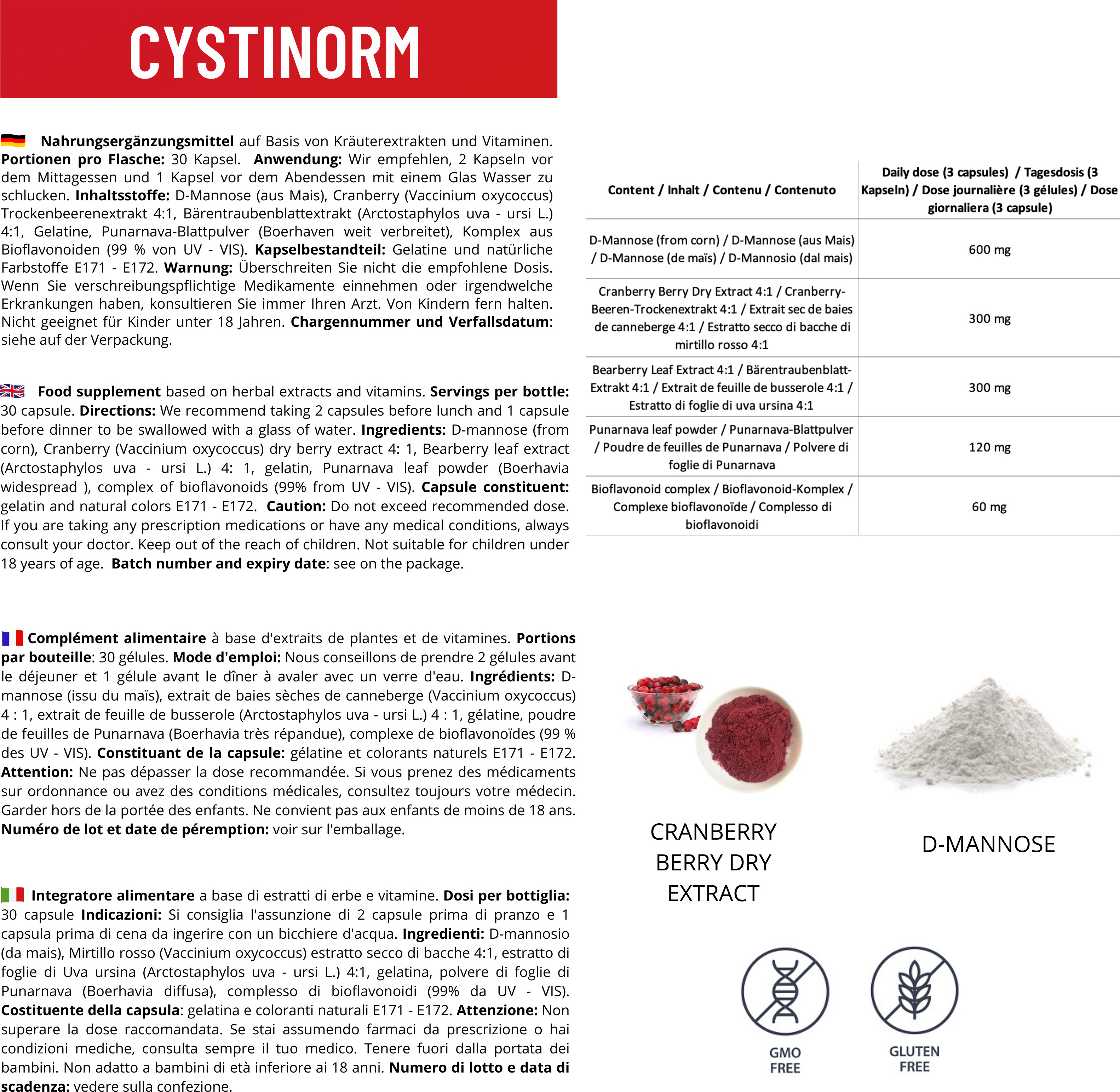 Kategorie: Nahrungsergänzungsmittel - cystinorm - GTIN:7649992273141 - Cystinorm ist ein Nahrungsergänzungsmittel, das nur auf natürlichen Inhaltsstoffen basiert und entzündungshemmende Eigenschaften hat Die Moosbeere ist nützlich für die Ausscheidung von überschüssiger Flüssigkeit, und in Kombination mit der Bärentraube wirkt sie synergistisch und verbessert die Funktionalität der Harnwege Cystinorm bekämpft alle Blasenentzündungen bakteriellen Ursprungs; D-Mannose hemmt die Bakterien und treibt sie mit dem Urin aus, Moosbeere-Extrakt schützt die Harnwege. Hergestellt in GMP-zertifizierten Fabriken, glutenfrei und GMO-frei - 49,00 Euro bei Amazon Marketplace Health & Personal Care - gefunden von billiger.de ![]() ![]() Cystinorm cysti - norm Blase eBay Harnwege Pflanzenextrakte Bioflavonoidkomplex