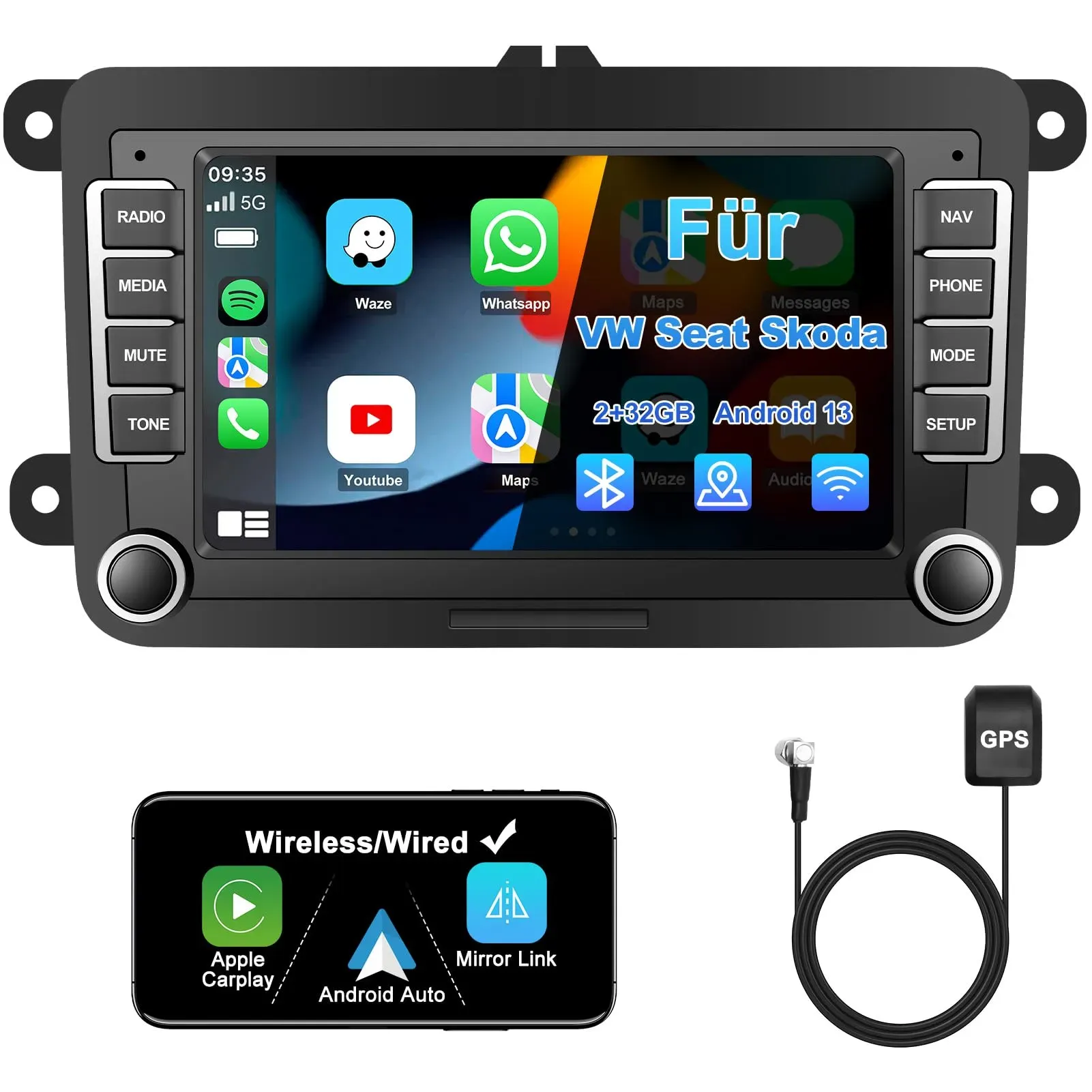 Kategorie: Car-Multimedia-Systeme - Essgoo - GTIN:0762032095828 - Audio- und Videowiedergabe Wiedergabeformate , MP3 MP4 MP5 FLAC JPEG WMA WAV, Radiofunktionen , Digitalradio (DAB+) RDS FM AM, Netzwerk- und Verbindungsarten Bluetooth-Version , 4,1, Allgemein Typ Display , Farb-Display, Funktionen , 2GB+64GB, Lieferumfang , 1 X Android Autoradio 1 X Marco 1 X Halterung & Schrauben 1 X GPS-Antenne 2x Stromkabel 1 X Cinch-Kabel 1 X Backup-Kamera-Eingangskabel 1 X USB-Verlängerungskabel 1 X Montageanleitung 1 X Radio-Adapterkabel, Ausstattung , Tastenbeleuchtung, Größe Schacht , DIN 2, Stromversorgung Art Stromversorgung , externes Netzteil, Betriebsspannung , 12V V, Technische Daten WEEE-Reg.-Nr. DE , 89406397, - 99,99 Euro bei OTTO - gefunden von billiger.de Ein beliebtes Modell für VW-Fahrzeuge mit Android 13, DAB, Navi und Wireless Carplay/Android Auto. ![]() ![]() Jimtour Autoradio mit Bildschirm Bluetooth für VW Polo Golf 5 6 T5 Passat Caddy Seat Skoda, 2Din Auto Radio 7 Zoll Touch Display Android 13,mit DAB Navi WLAN Carplay Android Auto Lenkrad Strg