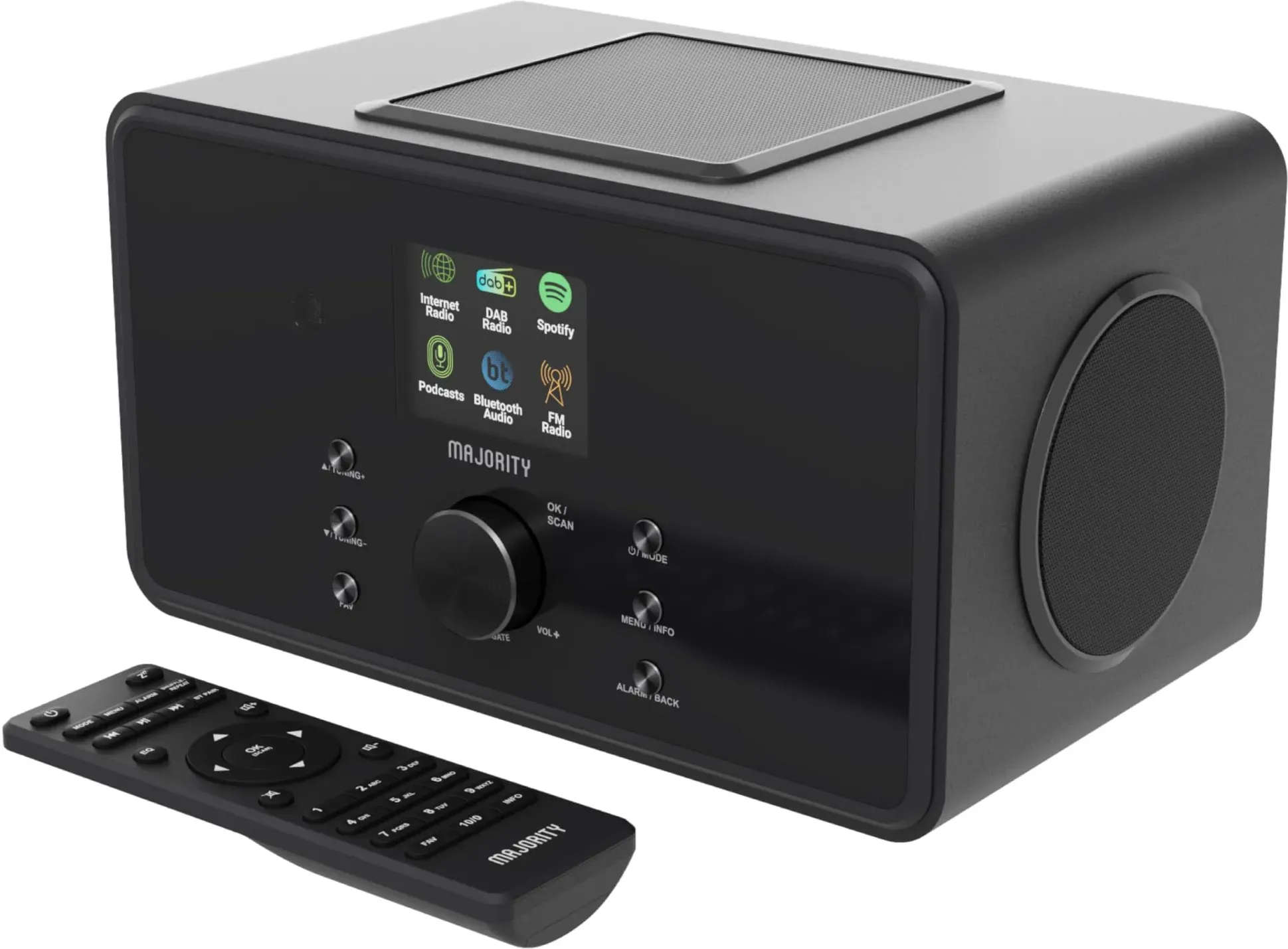 Kategorie: Radios - MAJORITY - GTIN:5056444108197 - KLANGSTARKES DAB RADIO MIT BLUETOOTH: Genießen Sie beeindruckenden 100W 2.1-Sound über zwei Lautsprecher und einen internen Subwoofer. Unser dab+ radio mit bluetooth eignet sich perfekt als küchenradio, digitalradio und internetradio klein für hochwertige Musik in jedem Raum. VIELFäLTIGE VERBINDUNGSMöGLICHKEITEN: Streamen Sie Ihre Lieblings-Podcasts oder nutzen Sie Spotify Connect über unser wlan radio mit bluetooth. Unser radio dab plus internetradio wlan bietet Zugriff auf internet radios weltweit und sorgt für nahtloses Hörerlebnis. INTUITIVE BEDIENUNG: Steuern Sie das internet radio wlan bequem per radio mit fernbedienung. Das dab radio mit fernbedienung bietet Ihnen einfachen Zugriff auf internetradio wlan, dab+ radio, und digitalradio dab plus für Ihre Lieblingssender. UMFASSENDE AUSWAHL AN RADIOSENDERN: Unser radio dab+ empfängt tausende von internet radios. Nutzen Sie das dab bluetooth radio als digital radio oder internet radio mit bluetooth wlan und erleben Sie verlustfreien Klang mit unserem wlan-radio, ideal für jeden Musikliebhaber. WAS IST IN DER BOX: Dieses Paket enthält 1x Bard 1x Netzkabel, 1x Fernbedienung, 1x 3,5mm AUX-Kabel und eine leicht verständliche Bedienungsanleitung. Abmessungen: 23,5 x 12,8 x 13,5cm; 2kg - 149,95 Euro bei Amazon Marketplace CE - gefunden von billiger.de Dieses Internet-/DAB+ Radio bietet eine breite Palette an Funktionen wie Spotify, Bluetooth und WLAN. ![]() DABMAN i610 Internet-/DAB+ Radio (Spotify, 2.1 Sound, Bluetooth/UKW, WLAN, USB)