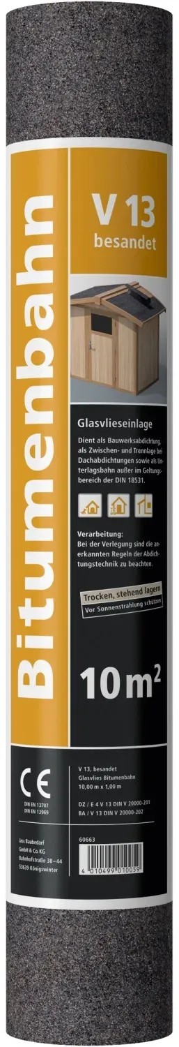 2.50 /m - Kategorie: Zubehör für Gartenhäuser - GTIN:5907732902020 - Die Bitumen Dachpappe mit Glasvlieseinlage V 13 besandet wird verwendet als Unter- und Zwischenlage für Gartenhäuser, Pavillons, Carports, Kleintierställen u. ä. Die Stärke der Dachpappe beträgt 2,4 kg/m2. - 24,99 Euro bei OBI - gefunden von billiger.de Diese Bitumenbahn bietet eine große Fläche von 10 m² zu einem attraktiven Preis für umfassende Dachabdichtungen. ![]() Manomano.d e