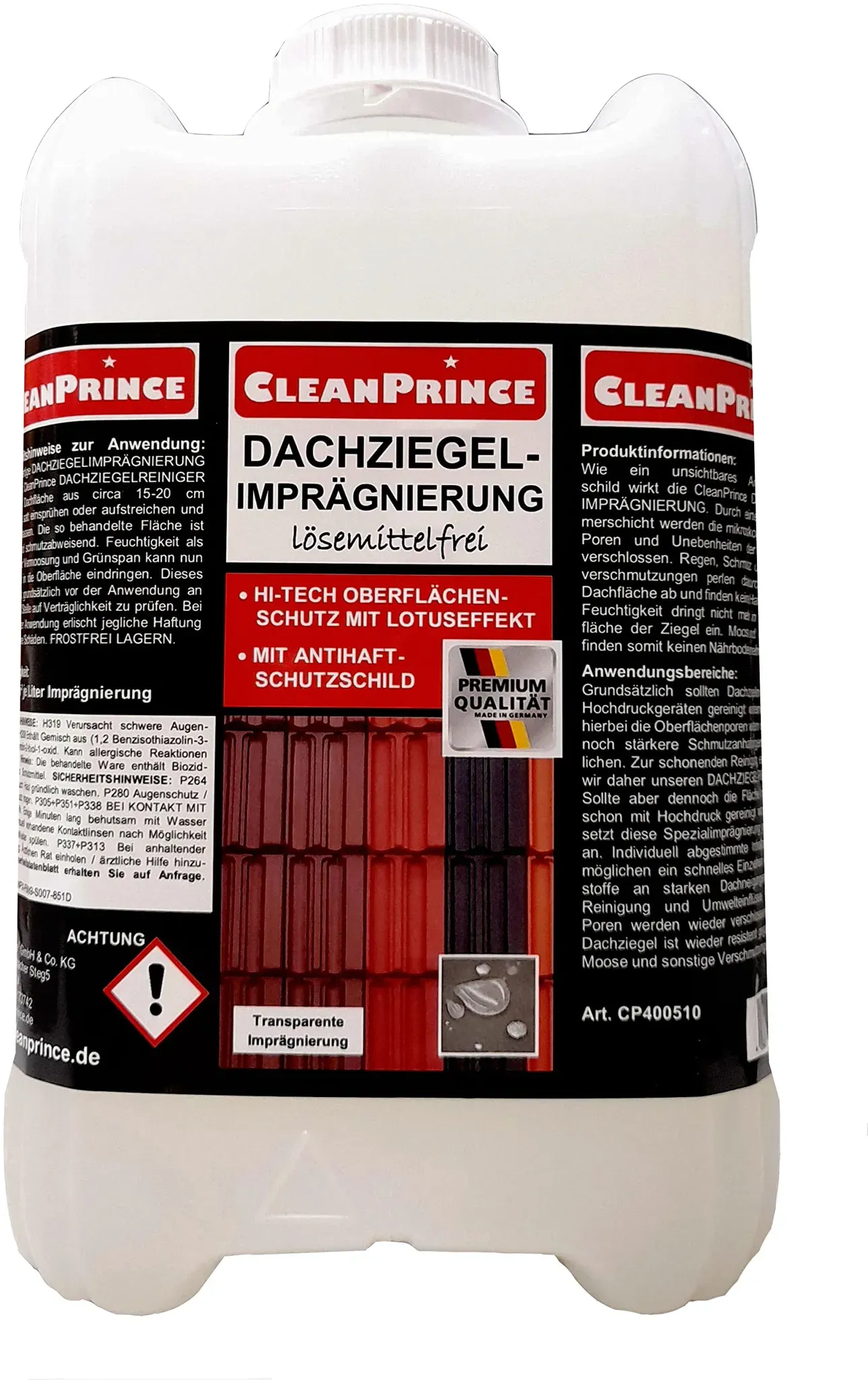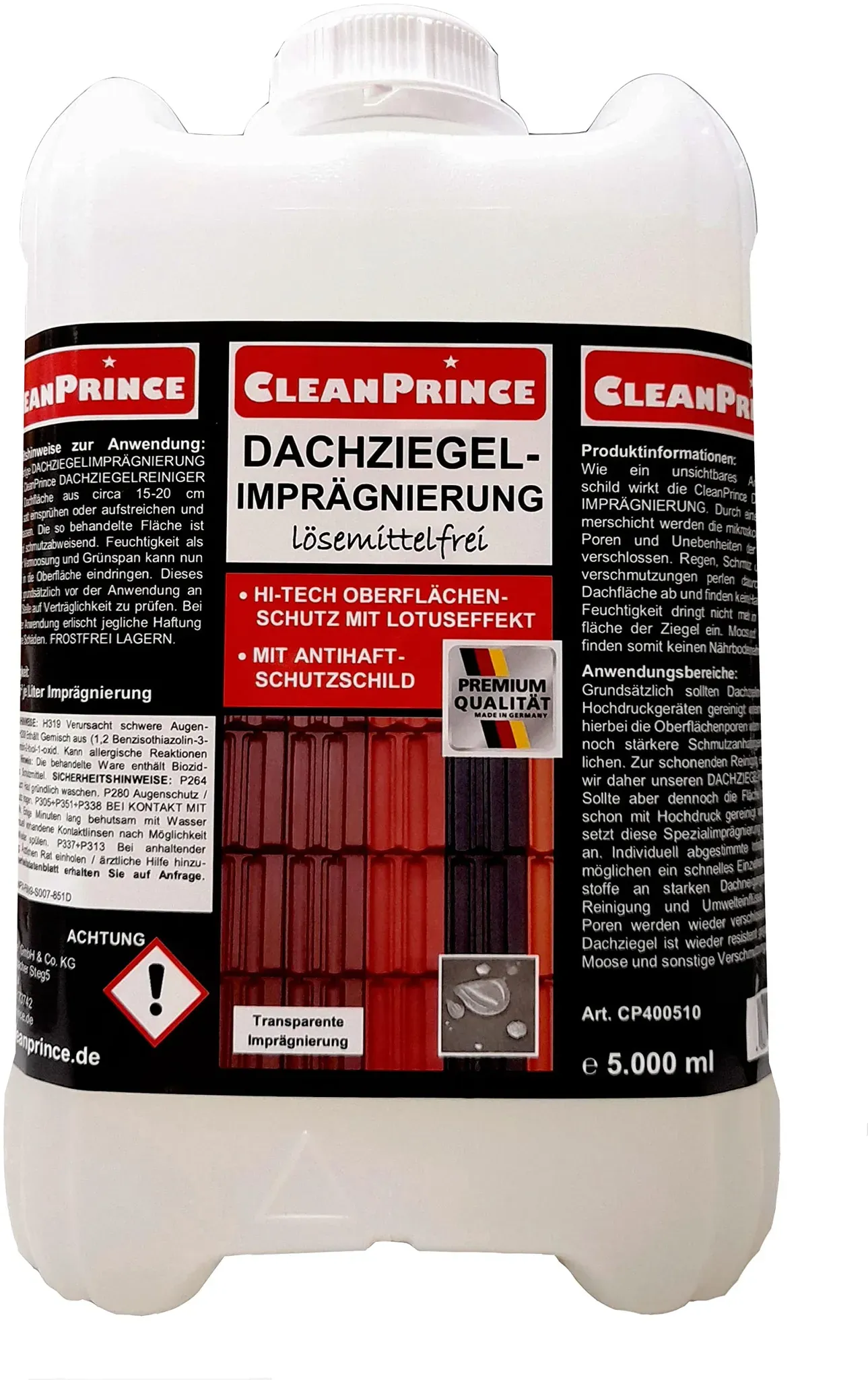 Zustand: Neu - 16,45 € / l - Moosbekämpfung - CleanPrince - CPB01KG - EAN: 4260355032743 - lösemittelfrei Hi-Tech Oberflächenschutz mit Lotuseffekt mit Antihaft-Schutzschild Ergiebigkeit: 25-30 m² je Liter Imprägnierung je nach Saugkraft und Oberfläche der Ziegel (lasiert, engobiert, Betonziegel) - Verkäufer: CleanPrince im amazon.de Marketplace Dieses lösungsmittelfreie Produkt ist eine gute Wahl für umweltbewusste Anwender, die eine Dachziegel-Imprägnierung suchen. ![]() ![]() Cleanprince 2 Liter Dachziegelimprägnierung Dachziegel-Imprägnierung Dachversiegelung Dachimprägnierung lösemittelfrei Versiegelung CleanPrince Schutz Ziegel Dachziegelschutz Schutzanstrich Schutz vor Witterung Algen Moos Grünspan Wasserflecken Grünbelag, mit Antihaft-Schutzschild,Hightech Oberflächenschutz mit Lotuseffekt, ohne Lösemittel, Ergiebigkeit: 25-30 m2 je Liter Imprägnierung