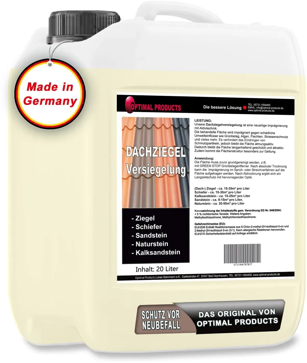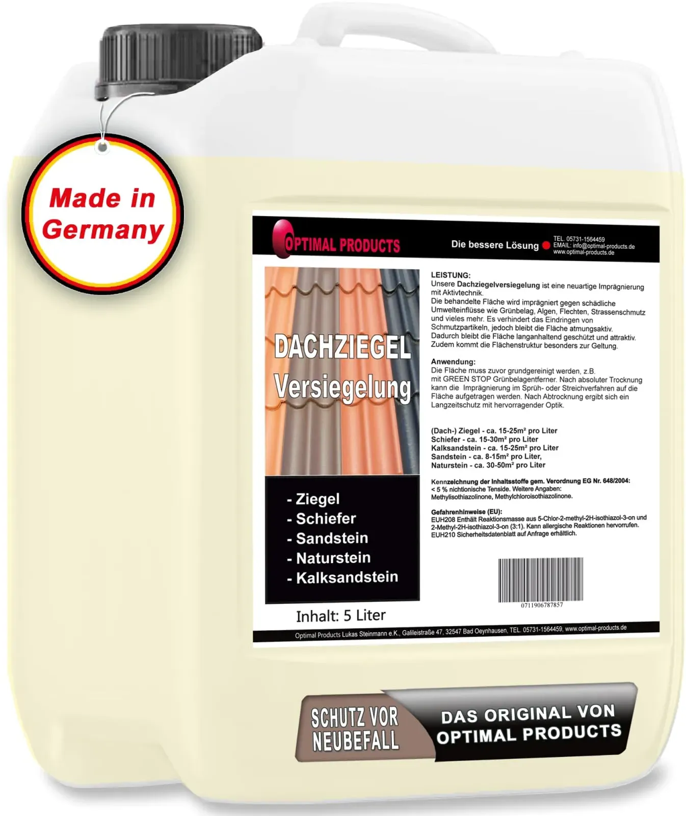 Zustand: Neu - 4,99 € / l - Dachziegel - Optimal Products die bessere Lösung Optimal Products Lukas Steinmann e.K. - #4010100201# - EAN: 4260724781401 - STONE SAFE: Die behandelte Fläche wird imprägniert gegen schädliche Umwelteinflüsse wie Grünbelag, Algen, Moosbefall, Flechten, Straßenschmutz, Frostschäden uvm LANGZEITSCHUTZ: Dachziegel benötigen einen optimalen Langzeitschutz um ihre schöne Optik zu erhalten. Unsere Dachziegelversiegelung bietet nicht nur einen lichtbeständigen Dauerschutz, sondern hat auch eine farbauffrischende Wirkung MIT ABPERLEFFEKT: Durch seinen Abperleffekt wirkt die Dachversiegelung auf den Oberflächen wasser- & schmutzabweisend und vermindert die Feuchtigkeitsaufnahme UNIVERSELL EINSETZBAR: Unsere Imprägnierung kann für Natur- und Kunststeine im Innen-& Außenbereich, Fliesen (unglasiert), Marmor, Granit, Sandstein, Ziegel, Klinker, Schiefer, Pflasterplatten & auch für Naturhölzer genutzt werden OPTIMAL PRODUCTS: Ihr Fachmann für qualitativ hochwertige Reiniger, Konzentrate, Rostumwandler, Silikonöle & Schmierstoffe mit 4 n Erfahrung. Familiengeführt, solide und mit einem fairen Preis-Leistungsverhältnis - Verkäufer: Optimal-Products im amazon.de Marketplace Die 5-Liter-Größe dieses lösungsmittelfreien Produkts bietet ein gutes Preis-Leistungs-Verhältnis für größere Flächen. ![]() ![]() CleanPrince 5 Liter Dachziegelimprägnierung Dachziegel-Imprägnierung Dachimprägnierung Dachversiegelung lösemittelfrei Versiegelung Schutz Ziegel Dachziegelschutz Schutzanstrich
