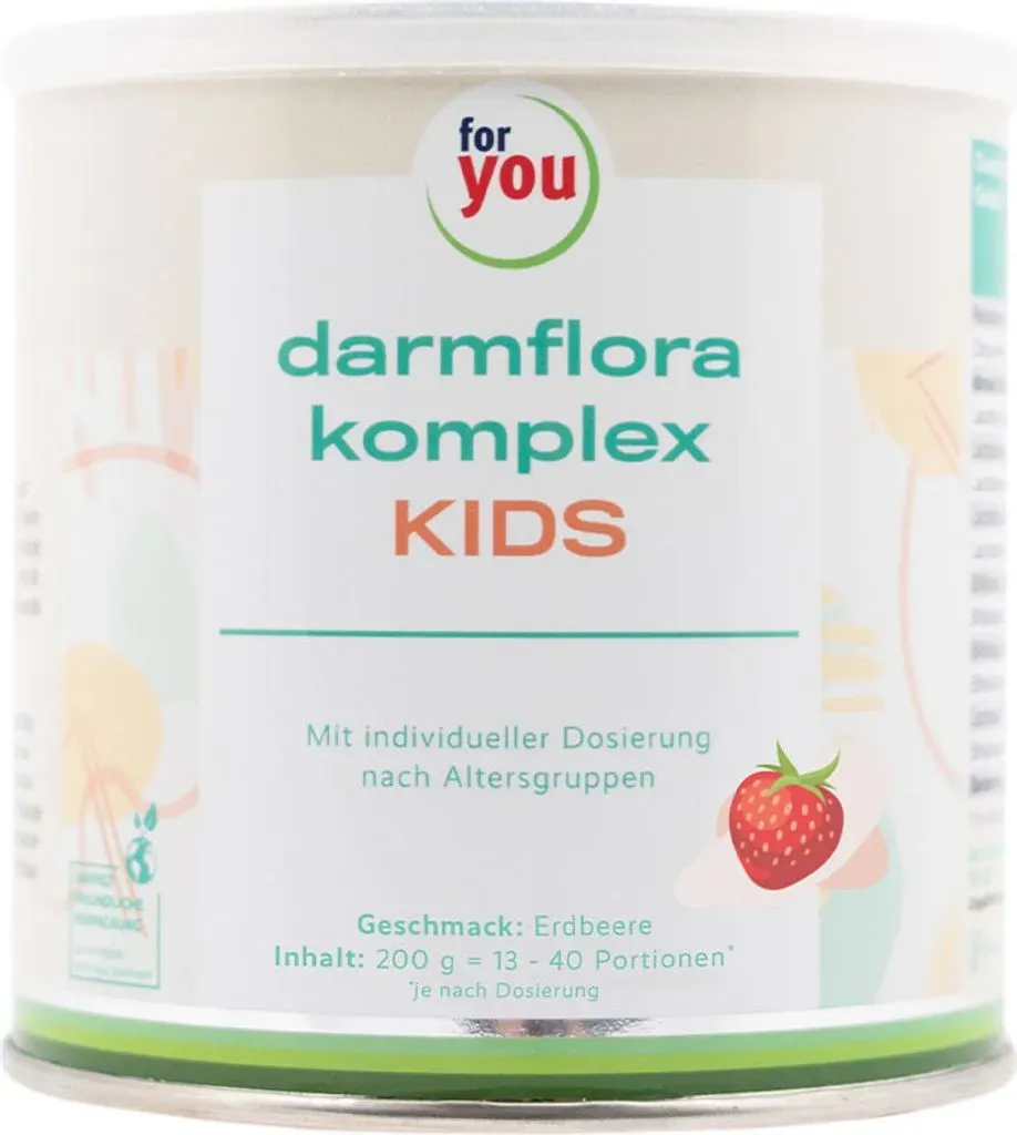 A bis Z Multivitamine Vitamine, Mineralien & Nahrungsergänzungsmittel Gesamtsortiment Beauty + Gesundheit Gesundheit Vitamine + Nahrungsergänzung Vitamine & Ergänzungen - EAN:4260538092762 - Darmflora Komplex Kids ist ein Nahrungsergänzungsmittel in Pulverform für Kinder, bestehend aus Bakterienkulturen und Ballaststoffen. Zur dauerhaften Einnahme für Kinder ab n. Inhalt: 200 g (40 Portionen). Es ist auf den Bedarf der kindlichen Darmflora und ihrer Entwicklung abgestimmt und ist individuell nach Altersgruppe dosierbar und für die ganze Familie geeignet. - 11 Bakterienstämme - 5 Mrd. Bakterien ab n 10 Mrd. ab n 15 Mrd. ab 1 n - 2 Arten von Ballaststoffen - Sehr gut verträglich - Zum Aufbau der Darmflora nach Antibiotikaeinnahme geeignet - gut löslich - Glutenfrei, laktosefrei, zuckerfrei und vegan - Geschmack: Erdbeere Darmflora Komplex Kids ist ideal, um die Darmflora von Kindern und Jugendlichen zu stärken und dadurch die gesunde Entwicklung der Kinder zu unterstützen. Die Bakterienbesiedelung des Magen-Darm-Traktes beginnt mit der Geburt. Eine natürliche Geburt und anschliessendes Stillen fördern die Entwicklung eines gesunden Mikrobioms. Kaiserschnittgeburten, Infekte und Antibiotikaeinnahmen können die natürliche Ansiedelung wichtiger Bakterien im Darm verlangsamen oder verhindern. Die Bakterienstämme und die präbiotischen Ballaststoffe in Darmflora Komplex Kids wurden anhand wissenschaftlicher Studien zur Wirkung von Probiotika auf die Kindergesundheit ausgewählt. ... Kaufland.de bietet das Darmflora Komplex Kids zu einem guten Preis an. ![]() ![]() for you darmflora komplex kids