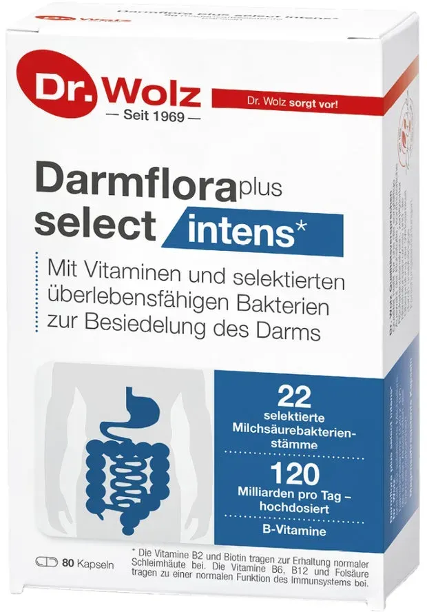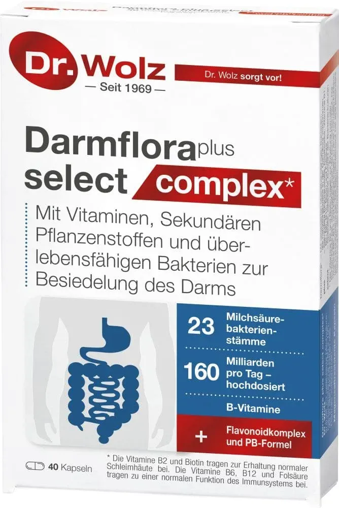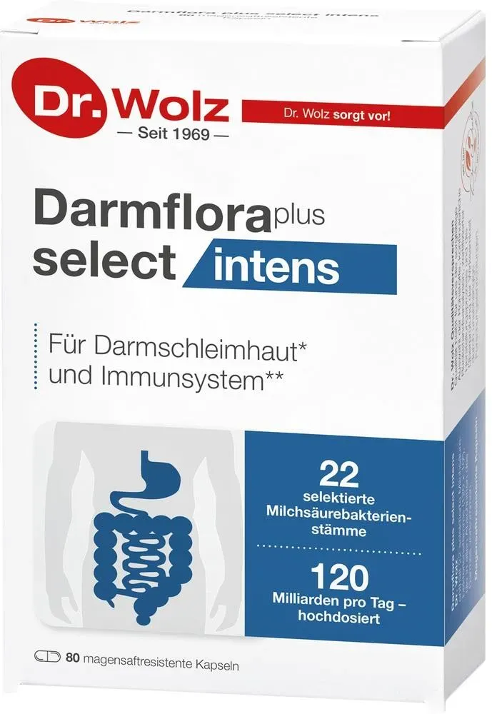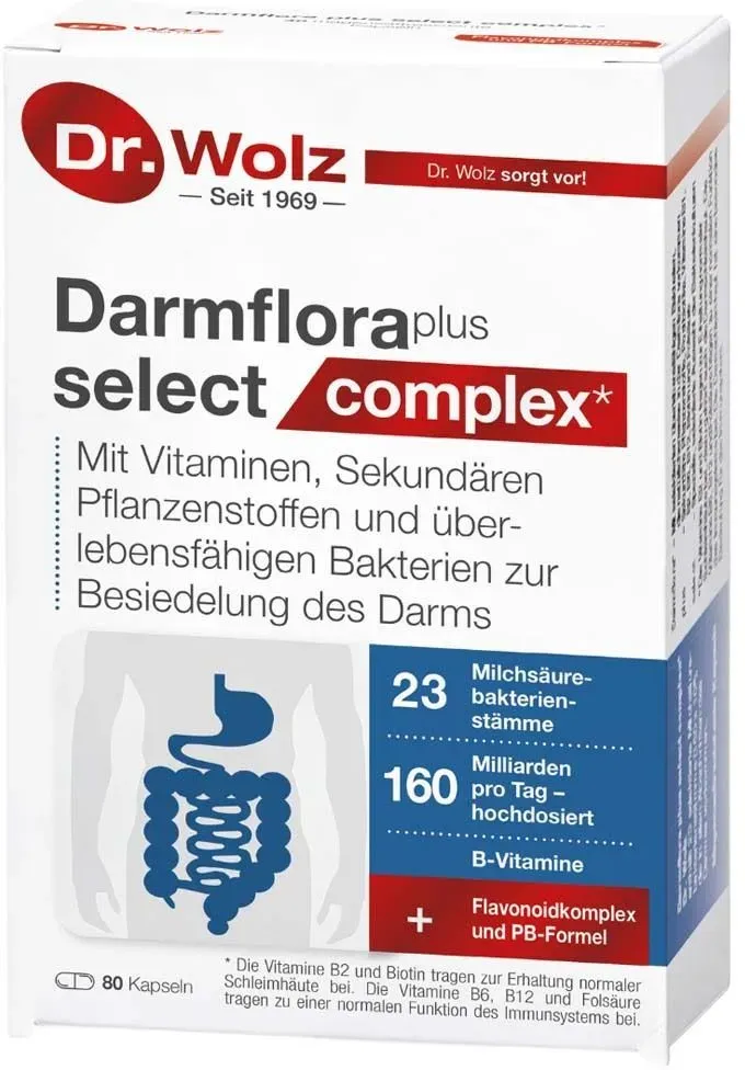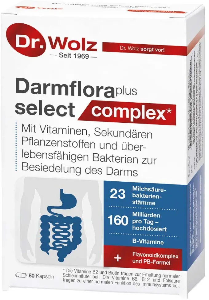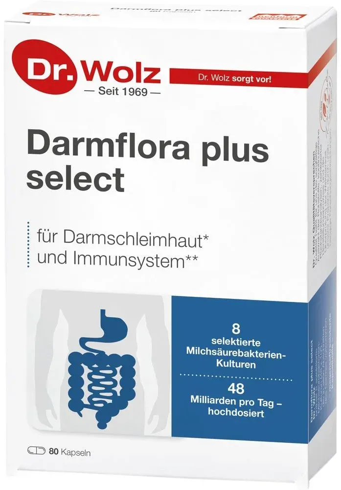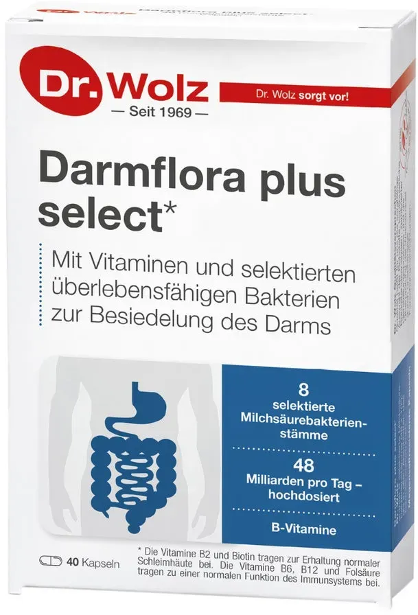 Darmflora plus select META PreisvergleichMit dem Meta-Preisvergleich suchen Sie gleichzeitig bei den großen Preisvergleich Portalen!Jetzt live Suche nach darmflora plus select starten! Darmflora plus select KaufberatungDarmflora Plus Select ist ein probiotisches Kombinationspräparat von Dr. Wolz, das 8 ausgewählte Milchsäurebakterienstämme mit insgesamt 48 Milliarden lebenden Bakterien pro Tagesdosis enthält. Zusätzlich sind wichtige B-Vitamine (B1, B2, B6, B12, Biotin, Folsäure) enthalten, die die Darmschleimhaut und das Immunsystem unterstützen[2][4][5]. Wichtig zu beachten sind folgende Punkte: