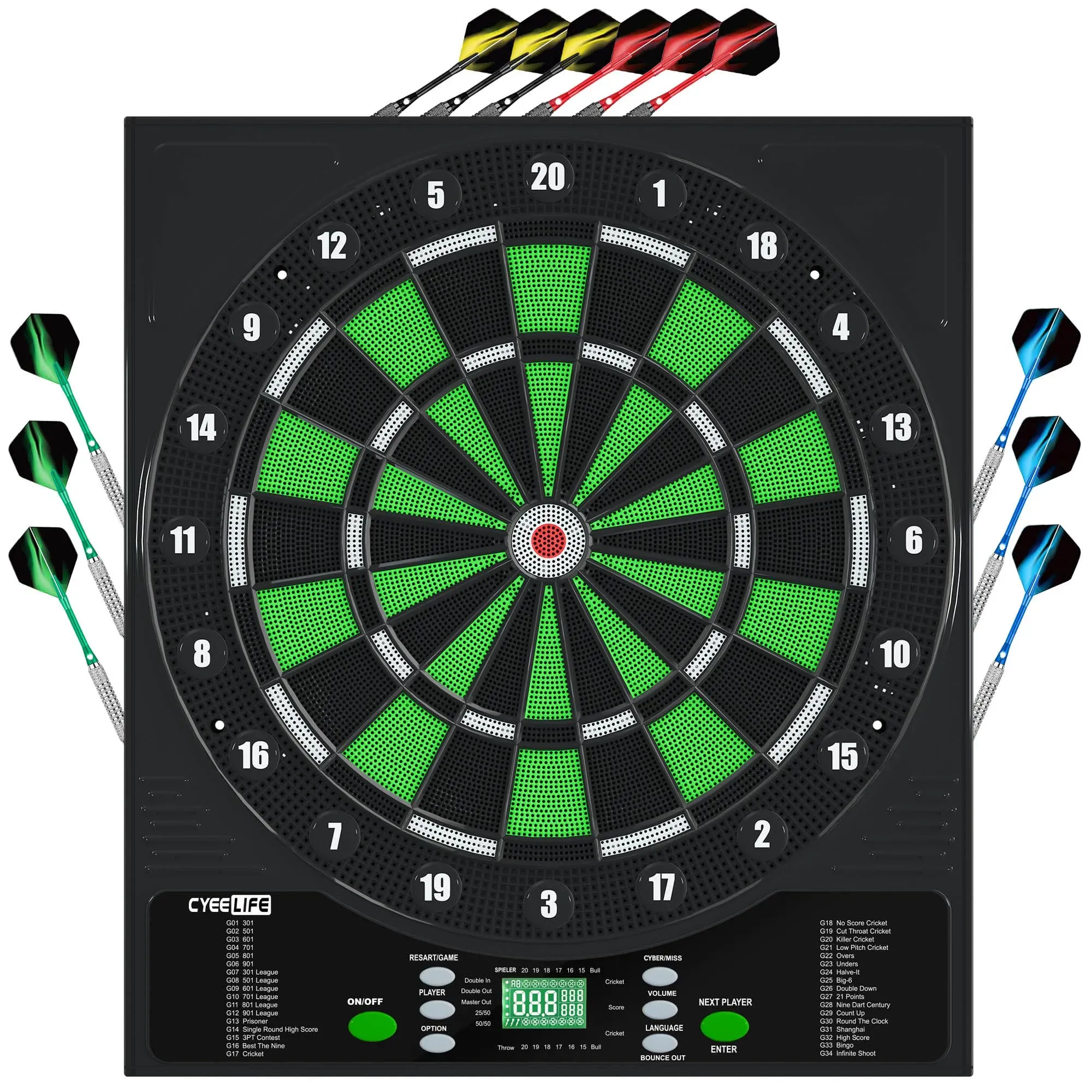Auf Lager Versand durch AmazonCyeeLife Elektronische Softdartscheibe Dartboard, Dartspiel mit 12 Darts und Zubehör Set, 34 Spiele 350 Varianten für 1 bis 8 Spieler, 8 Soundstufen, Mehrsprachig - Keine Datenleitung enthalten?