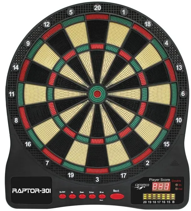 Zustand: Neu - Klassische Dartboards - Turnart - Cible+surround - - 🏆ALLES, WAS DU BRAUCHST, IN EINEM SET! EINFACHE EINRICHTUNG - Bestelle das hochwertige Dart-Set von Turnart, bestehend aus einem strapazierfhigen Sisal-Dartboard, sechs montierten Darts, einer Oche-Linie, einer Bedienungsanleitung und einem Montageset. Packe das Geschenk aus, hnge es auf und du kannst in wenigen Minuten Spa mit dem Dartboard haben. 🏆Prost mit Freunden! Geniee die Party! Das beste Eisbrecherspiel. Zeige dein Talent mit den ausgezeichneten Darts! Zielen und treffen! 🏆GRSSERE FLCHEN & WENIGER ABPRALLER - Hergestellt aus hochfestem Stahl, maximieren dnnere runde Drahtbefestigungen den Trefferbereich. Der klammerfreie Bullseye spart Platz, was bedeutet, dass weniger Darts verloren gehen. Selbst wenn dein Dart unglcklicherweise das Drahtgitter trifft, besteht immer noch eine Chance, dass er darber gleitet und das Dartboard durchdringt. 🏆Dick, weich und geruchsfrei! Der EVA-Schutzring bietet zustzliche 13 cm Schutz und eignet sich fr ein 45 cm Dartboard. Er ist 3 cm dick und die Stahlpfeilspitze wird nicht hindurchstoen. 🏆EINFACHES ZIELEN/AUSRICHTEN - Lebhafte, nicht verblassende Farben sind tiefer und aufflliger und halten auch bei hufiger Nutzung stand. Diese Art von Tinte sorgt auch dafr, dass dein Dartboard blendfrei ist. Die flachen Ziffern auf einem reinweien abnehmbaren Zahlenring verbessern deine Treffgenauigkeit. 🏆Einfach zu installieren, wie das Lsen ... ![]() ![]() Carromco Carromco Elektronik Dartboard Raptor-301, 4-Loch Abstand 92231