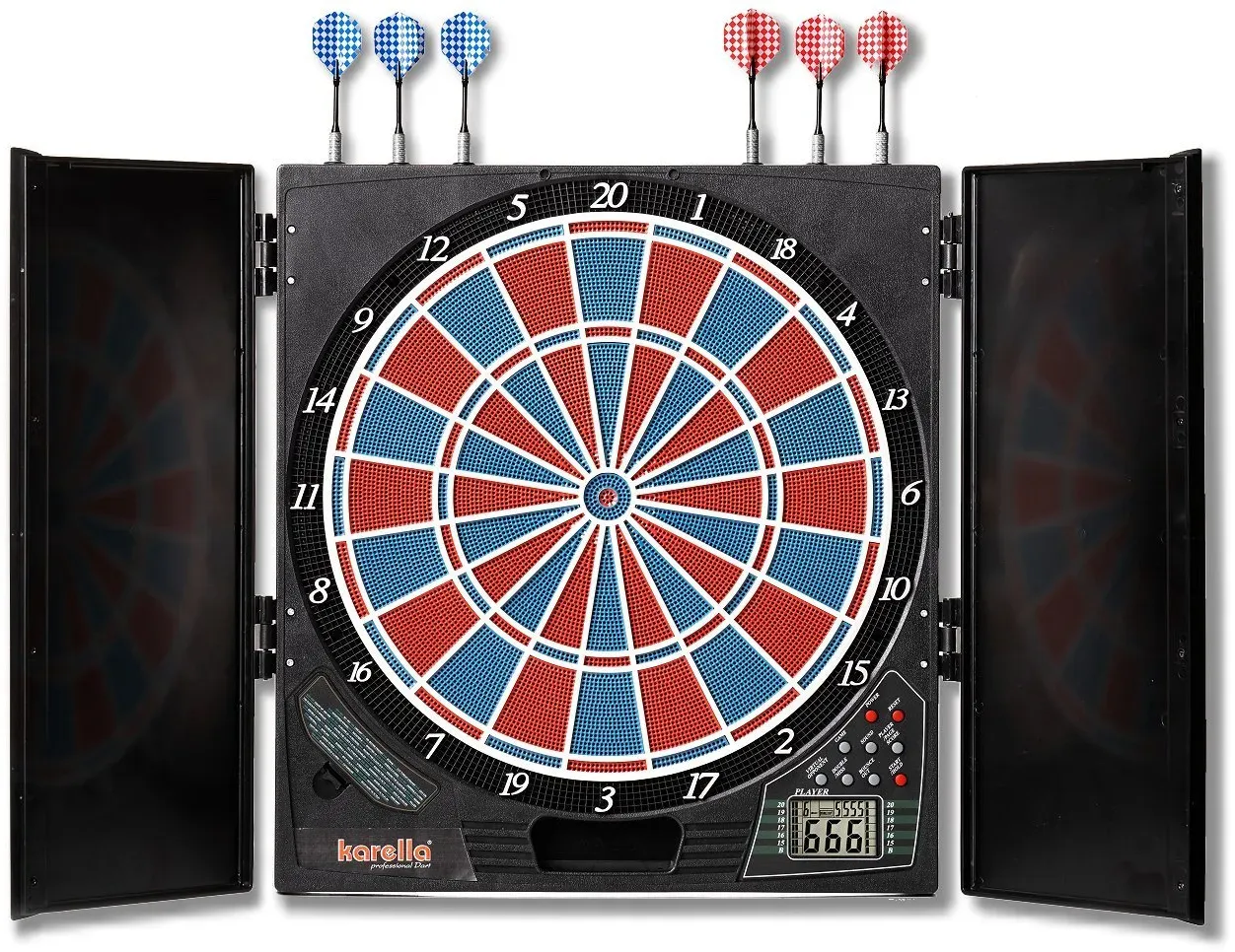15 Händlerangebote bei billiger.de - Kategorie: Dartscheiben - KARELLA - Dartautomat Karella CB-25, Turnierausführung Elektronisches Dartspiel mit klassischen Schranktüren und Dartpfeilhalterung im Rahmen. Blau-Rote Farbsegmente und weißem Spider mit schwarzem Auffangring. Karella CB-25, Dartscheibe, Blau, Rot, Stahlspitze, LCD, Erwachsener, 550 mm Karella CB-25. Produkttyp: Dartscheibe, Produktfarbe: Blau, Rot, Dartscheibentyp: Stahlspitze. Breite: 550 mm, Gewicht: 3,5 kg. Menge pro Packung: 1 Stück(e). EU TSD Warnung: Nicht für Kinder unter 36 Monaten geeignet, Nur für häuslichen Gebrauch bestimmt. Höhe: 550 mm, Tiefe: 45 mm - GTIN:4250283229322 ![]() ![]() Karella Elektronische Dartscheibe - Dartautomat "CB 25" inkl. 6 Softdarts,,