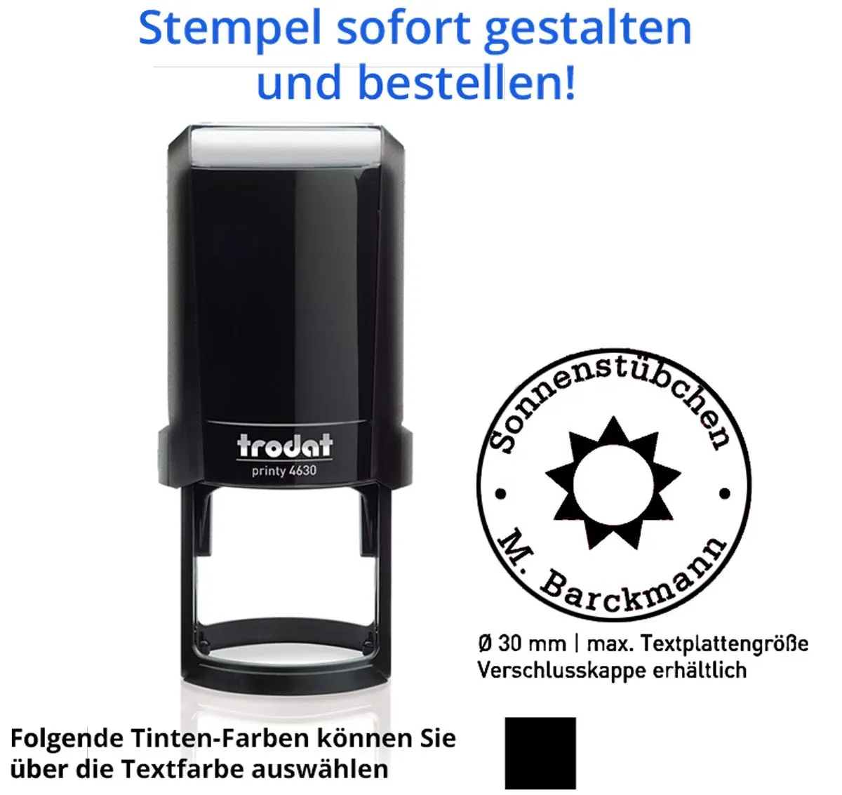 Gewöhnlich versandfertig in 2 bis 3 TagenStempel Trodat Printy 4630 rund (30x30 mm), für 5 Zeilen, in verschiedenen Farben, gleich Online gestalten!!! (schwarz)