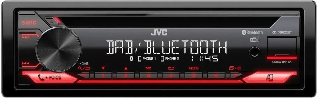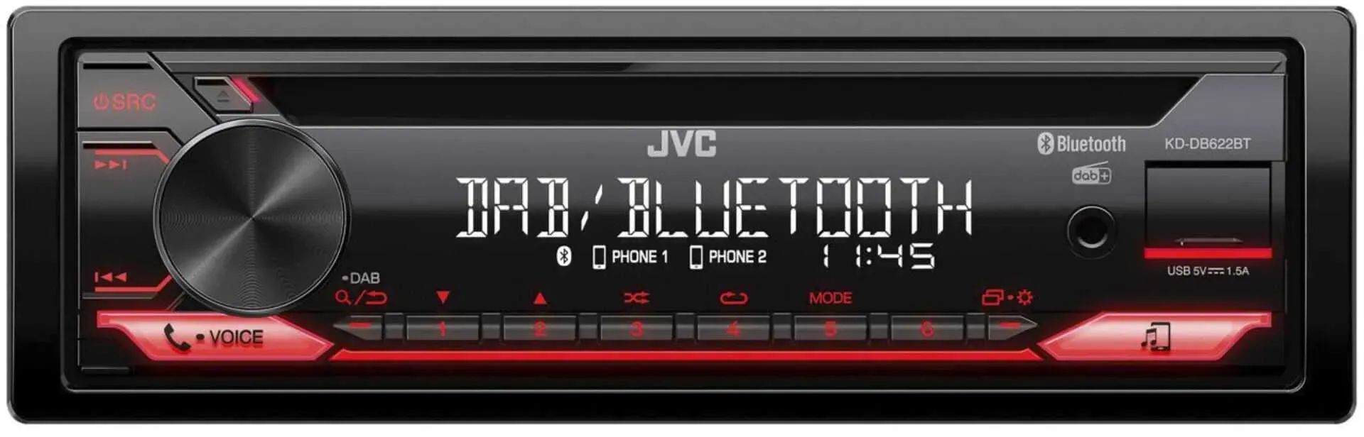 Auf Lager Versand durch AmazonJVC KD-DB622BT CD-Autoradio mit DAB+ und Bluetooth Freisprecheinrichtung (Soundprozessor, USB, AUX-In, Spotify Control, 4 x 50 Watt, rote Tastenbeleuchtung, Ohne Antenne)
