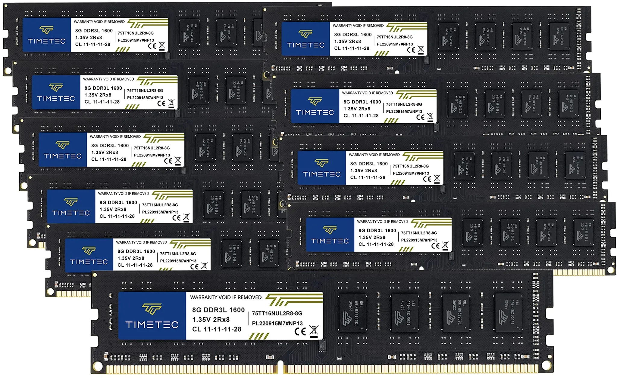 PC-Technik Arbeitsspeicher DDR3-RAM DDR3 Dual-Channel-Kits - EAN:0843591022408 - Die Corsair Vengeance DDR3-Speichermodule sind für Übertaktung konzipiert. Die DIMMs der Vengeance-Module werden mit speziell ausgewähltem Arbeitsspeicher mit hohem Leistungspotenzial gebaut. Die Module sind für eine optimale Wärmeableitung mit Aluminum-Kühlkörpern in einem auffälligen Design ausgestattet. So wirkt Ihr Gaming-PC noch dynamischer. Ein weiterer Bonus ist das attraktive Preisniveau von Vengeance-Speichermodulen, das Ihr Budget für den Systembau entlastet.- Speicherkapazität: 16 GB : 2 x 8 GB - ErweiterungsArt: Generisch - Technologie: DDR3 SDRAM - Formfaktor: DIMM 240-PIN - Speichergeschwindigkeit: 1600 MHz ( PC3-12800 ) - Datenintegritätsprüfung: Nicht-ECC - Latenz: CL10 ( 10-10-10-27 ) - Leistungsmerkmale: Dualer Kanal, Intel Extreme Memory Profiles (XMP 1.3), Vengeance-Niedrigprofil-Spreader , ungepuffert - Versorgungsspannung: 1.5 V - gefunden von Kelkoo Dieses Timetec 80 GB Kit (10x8GB) ist eine außergewöhnliche Option für Server oder spezielle Anwendungen, die eine extrem hohe Speicherkapazität erfordern. ![]() ![]() Timetec 80 GB KIT (10 x 8 GB) DDR3L / DDR3 1600 MHz (DDR3L-1600) PC3L-12800 / PC3-12800 Non-ECC Ungepuffert 1,35 V/1,5 V CL11 2Rx8 Dual Rank 240 Pin UDIMM Desktop-PC Computerspeicher RAM (SDRAM)