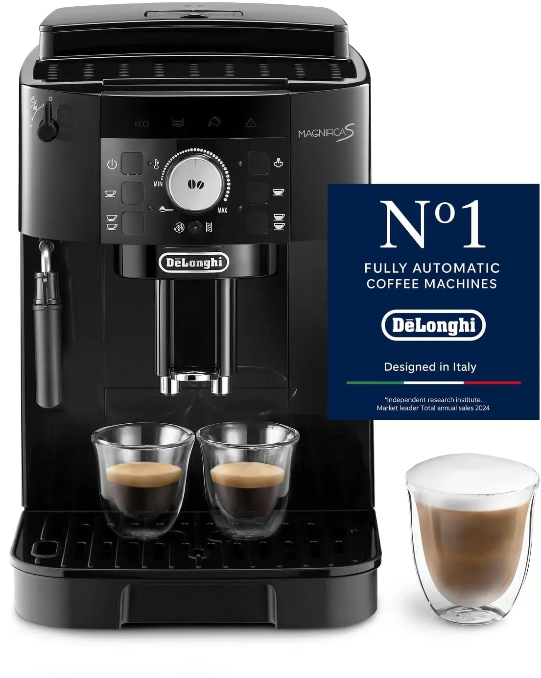 9 Händlerangebote bei billiger.de - Kategorie: Kaffeevollautomaten - De'Longhi - MAHLWERK: Jede Tasse Kaffee en Genuss, da die Maschine die Bohnen direkt vor dem Aufbrühen mahlt. Ausgestattet mit einem Bohnenbehälter und einem Fach vor vorgemahlenes Kaffeepulver EINFACHE BEDIENUNG: Dank 4 Direktwahltasten und einem Drehregler ist die Bedienung des Kaffeevollautomaten ein Kinderspiel. Zudem verfügt der Kaffeevollautomat über die 2-Tassen-Funktion für doppelten Espresso. BARISTA-STYLE: Die spezielle Aufschäumdüse ermöglicht ein perfektes Milchschaum Ergebnis für einen cremigen Cappuccino oder Latte Macchiato LEICHTE REINIGUNG: Die kompakte Brühgruppe ist wartungsarm, lässt sich vollständig aus der Kaffeemaschine herausnehmen und ermöglicht so eine einfache Reinigung des Maschineninnenraums TEMPERATURKONTROLLE: Das De'Longhi Thermoblock System brüht deinen Kaffee mit der idealen Temperatur auf, indem es die für jedes Getränk erforderliche Wassermenge erhitzt - GTIN:8004399027084 Ein Topseller, der eine einfache Bedienung und ein Kegelmahlwerk zu einem attraktiven Preis bietet. ![]() DE'LONGHI Kaffeevollautomat 'Magnifica S ECAM 21.118.B', schwarz, B:23,8cm H:35,1cm T:43cm, Kaffeevollautomaten, Einfache Bedienung (Direktwahltasten) Reinigung, Kegelmahlwerk, Topseller