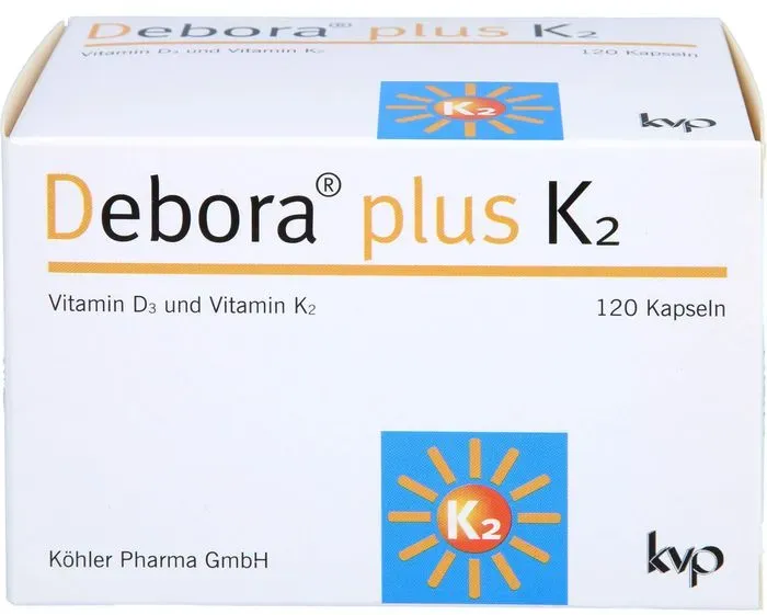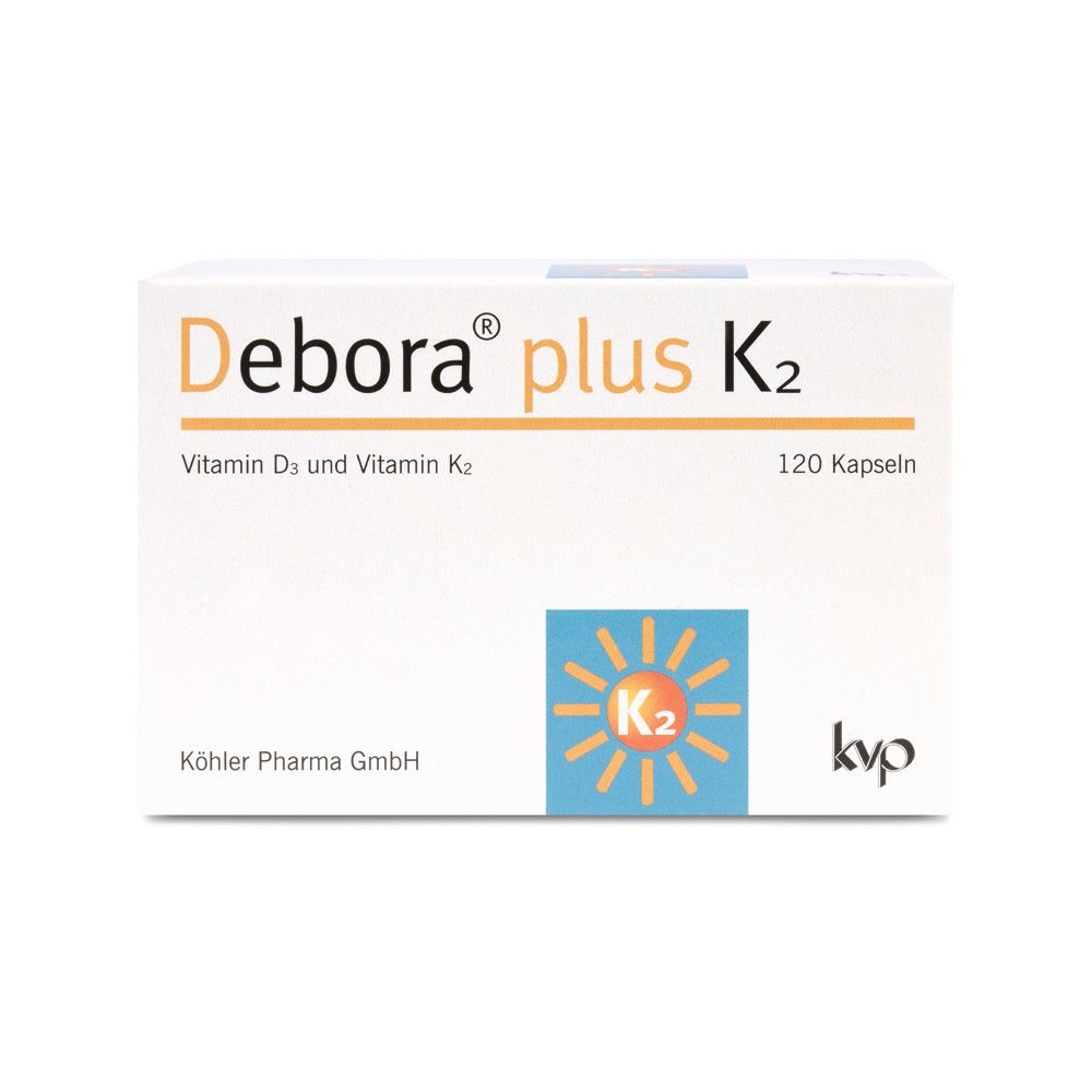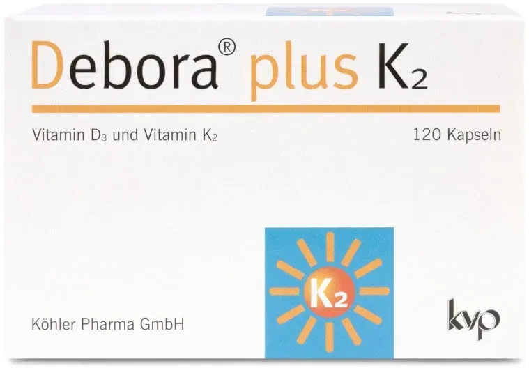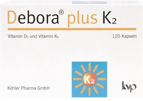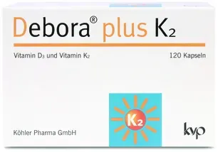 0,2 3 / 1 ct - Debora - EAN: 4150125101727 - Debora plus K2 Das kluge Duo für Ihre Gesundheit1234 1 Vitamin D3 unterstützt die normale Funktion des Immunsystems 2 Vitamin D3 und K2 tragen zur Erhaltung normaler Knochen bei Für eine zuverlässige Versorgung mit Vitamin D3 und K2 Sinnvoll... - bei shop-apotheke.com - aus Yadore Produktdaten ![]() Debora plus K2 Kapseln 120 St