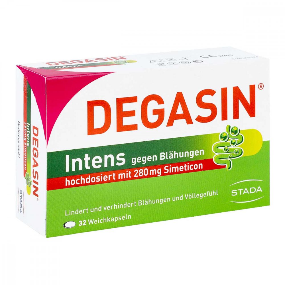 0,26 €/Stück - Kategorie: Arzneimittel - STADA - GTIN:4150169444767 - PZN:16944476 - Degasin® Intens 280mg gegen Blähungen und Völlegefühl 32 St - 8,26 Euro bei medikamente-per-klick.de - gefunden von billiger.de ![]() ![]() STADA DEGASIN intens 280 mg Weichkapseln 32 St