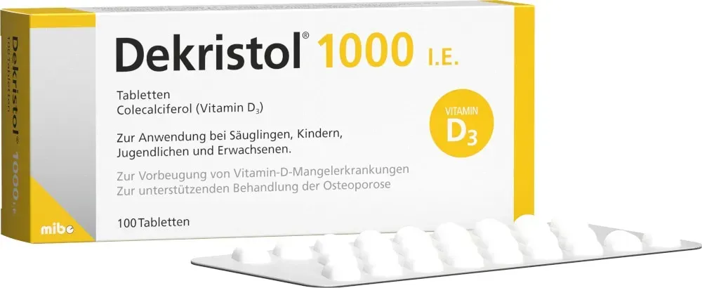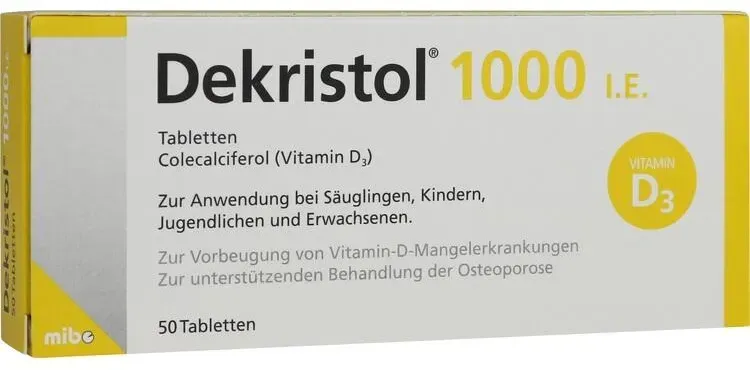 Dekristol 1000 META PreisvergleichMit dem Meta-Preisvergleich suchen Sie gleichzeitig bei den großen Preisvergleich Portalen!Jetzt live Suche nach dekristol 1000 starten! Dekristol 1000 KaufberatungDekristol 1000 sind Tabletten mit 1000 I.E. (Internationale Einheiten) Vitamin D3 (Colecalciferol), die zur Vorbeugung von Knochenschmerzen, -verformungen und zur unterstützenden Behandlung von Osteoporose eingesetzt werden[1][3]. Die Tabletten sind länglich, bikonvex, ca. 10 mm x 2,8 mm groß und können bei Bedarf geteilt werden[3]. Wichtig bei der Anwendung ist die individuelle Dosierung, die je nach Alter und Bedarf variiert. Üblich ist eine Einnahme von 1/2 bis 1 Tablette täglich, bei Säuglingen und Kleinkindern kann die Tablette in Wasser oder Milch aufgelöst werden[1]. Die Einnahme sollte idealerweise mit ausreichend Wasser erfolgen, und die Packungsbeilage sowie ärztliche Anweisungen sind zu beachten[1][2]. Beliebte Produktmerkmale und Marken:
