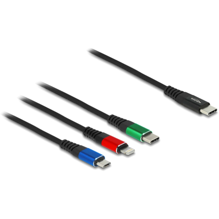 Delock - EAN: 4043619865963 - Kurzbeschreibung Dieses 3 in 1 Ladekabel von Delock dient zum Aufladen diverser Geräte, wie z. B. Tablets oder Smartphones mit Lightning, Micro USB-B oder USB Type-C Anschluss über eine USB Stromquelle. Praktischer Begleiter Das Kabel ist der ideale Begleiter für unterwegs, z. B. auf Dienstreisen oder im Urlaub, da es die drei gängigsten Anschlüsse für aktuelle Mobilgeräte in einem einzigen Kabel vereint. Somit wird lästiger Kabelsalat sowie unnötiges Herumtragen unzähliger Kabel vermieden. Qualität und Leistung Das Kabel ist, aufgrund seiner robusten Textilummantelung, starken Zugentlastung und Metallgehäuse an allen Kabelenden, sehr strapazierfähig und langlebig. Der hohe Drahtquerschnitt von 22 AWG unterstützt zudem eine stabile Stromversorgung von bis zu 3 A. - bei voelkner.de - aus Yadore Produktdaten ![]() ![]() DELOCK 86596 - # 1m eBay USB-C Ladekabel 3 in 1 (Micro USB / USB-C / Lightning)