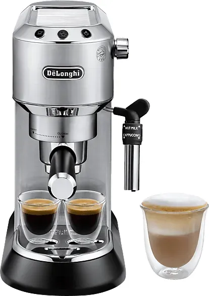 Espressomaschinen Kaffeemaschine Espressomaschine Kaffee- und Espressomaschinen - EAN:8004399331198 - Die DeLonghi Dedica Style EC 685.M macht mit einer Breite von nur 14,9 cm selbst die kleinste Küche zur italienischen Kaffeebar und verwandelt den Nutzer zum Barista. Die modernen Farben mit trendy Matt-Finishing und geprägtem Dedica Logo unterstreichen das einzigartige Dedica Design. Mit der Kombination aus professioneller Milchaufschäumdüse und höhenverstellbarer Tassenabstellfläche können Cappuccino, Latte Macchiato und andere Milch-Kaffeespezialitäten auch zu Hause stilecht in hohen Gläsern zubereitet werden. Dank elektronischer Temperaturkontrolle, individuell programmierbarer Tassenfüllmenge und schneller Einsatzbereitschaft bringt die Dedica Style EC 685.M immer das perfekte Ergebnis. - gefunden von Kelkoo ![]() ![]() DELONGHI Dedica - Style EC685.M eBay Espressomaschine Silber Matt