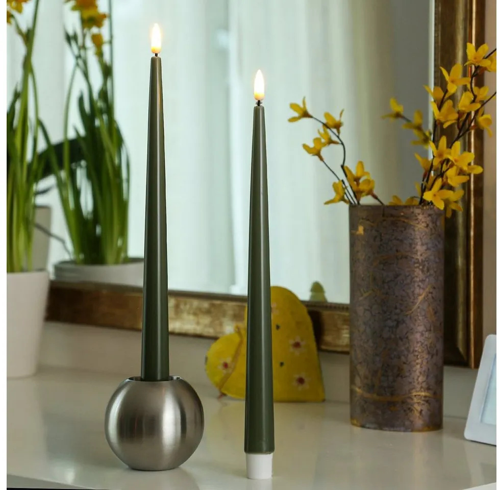 Kategorie: Kerzen - Deluxe Homeart - GTIN:4251280522461 - Die LED Stabkerzen MIA erzeugen dank ihrer super-realistischen 3D LED Flamme ein authentisches Kerzenlicht-Erlebnis. Dank des hochwertigen Echtwachs-Materials und der 3D Flamme sind die Tafelkerzen kaum von echten Kerzen zu unterscheiden. Mit einer Leuchtdauer von bis zu 300 Stunden bieten Dir die Dinnerkerzen viele leuchtende Stunden. Du wirst lange Deine Freude an dieser hochwertigen LED Stabkerzen haben. Die weiße Farbe der LED Stabkerzen sorgt für eine romantische und elegante Stimmung und Gemütlichkeit, ideal für Tischdekorationen bei Feiern. Die LED Stabkerzen können über eine optionale Fernbedienung gesteuert werden. Darüber kannst Du auch den eingebauten Timer aktivieren. - 25,90 Euro bei Amazon Marketplace Home - gefunden von billiger.de Ein vielseitiges Set aus 28cm hohen olivgrünen LED Stabkerzen, die sich gut in natürliche Dekorationen einfügen. ![]() ![]()