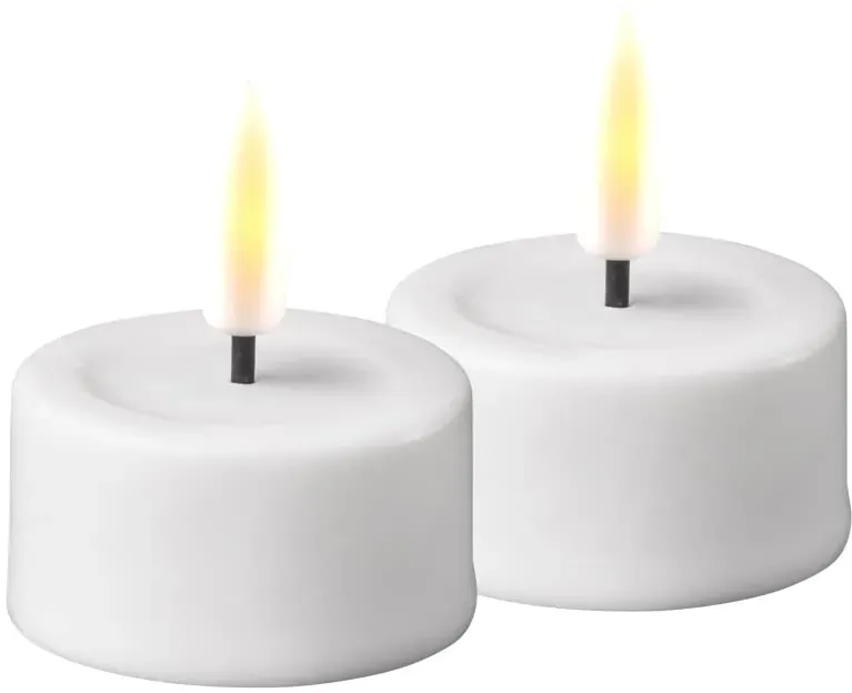 Kategorie: Kerzen - Deluxe Homeart - GTIN:5744001243688 - Die kleinen LED Teelichter aus echtem Stearin von DELUXE Homeart aus Dä,nemark haben eine tä,uschend echte Real Flame Flamme, die flackert und sind vielseitig einsetzbar.,Die patentierte Flamme kommt dem echten Kerzenlicht sehr nahe. Die Teelichter bestehen aus 100% echtem Stearin, was es noch naturgetreuer macht.,Die Teelichter sind vielseitig einsetzbar, und auch alleinstehend kö,nnen diese LED Teelichter genutzt werden, denn diese brennen nicht ab. ,,Lange Batterielaufzeit, benö,tigt 1xCR2450 (ist enthalten),Optionale Fernbedienung: ohne Fernbedienung kann die Kerze manuell ein und ausgeschaltet werden.,Eine Fernbedienung fü,r alle Deluxe Homeart LED Kerzen: Die optionale Fernbedienung ermö,glicht 4 verschiedene Timer-Dauern (2,4,6,8 Stunden) und kann die Helligkeit der Kerzen einstellen. Also unbedingt gleich mitbestellen!, - 14,90 Euro bei Skandeko - gefunden von billiger.de Dieses 2er Set in Weiß für 14,90 Euro ist eine solide Option mit Real Flame Technologie und kompakter Größe. ![]() ![]() Deluxe Homeart LED Teelicht im 2er Set mit Real Flame, 4.1 x H4.5cm, weiss