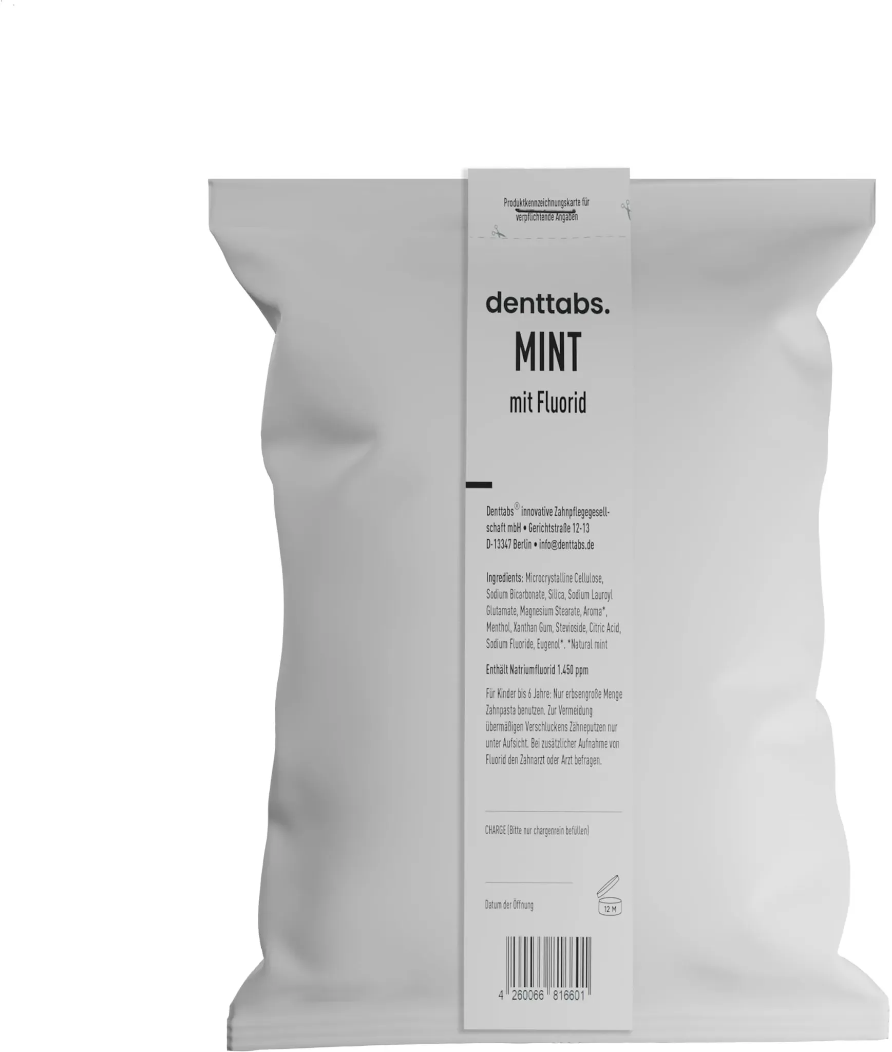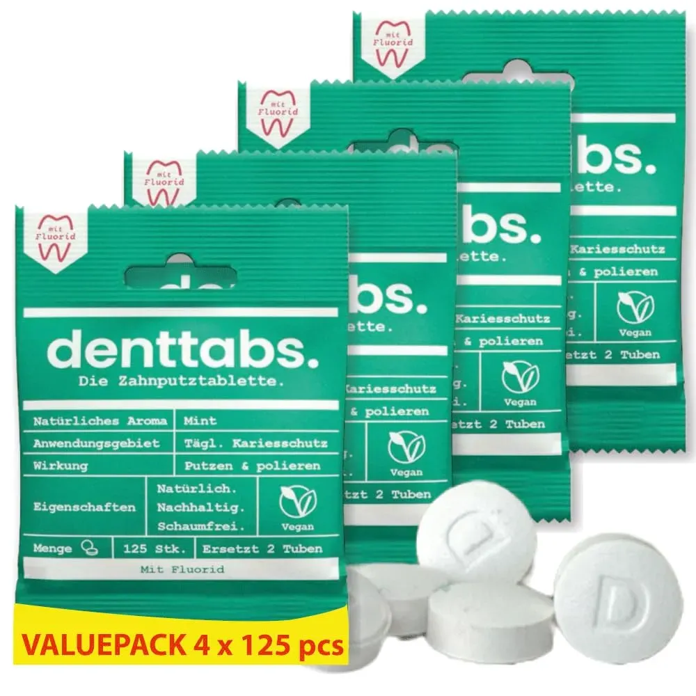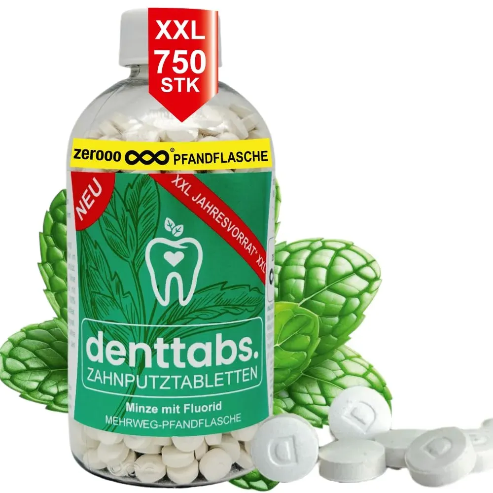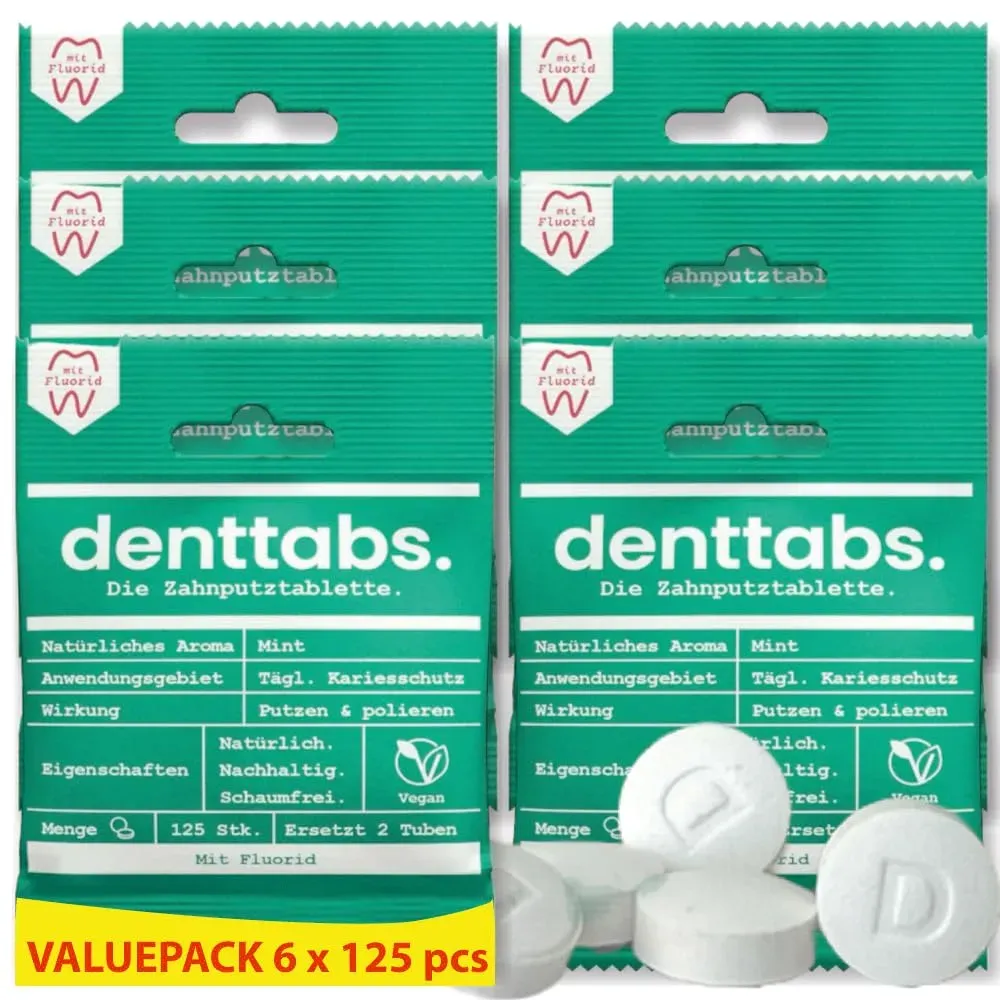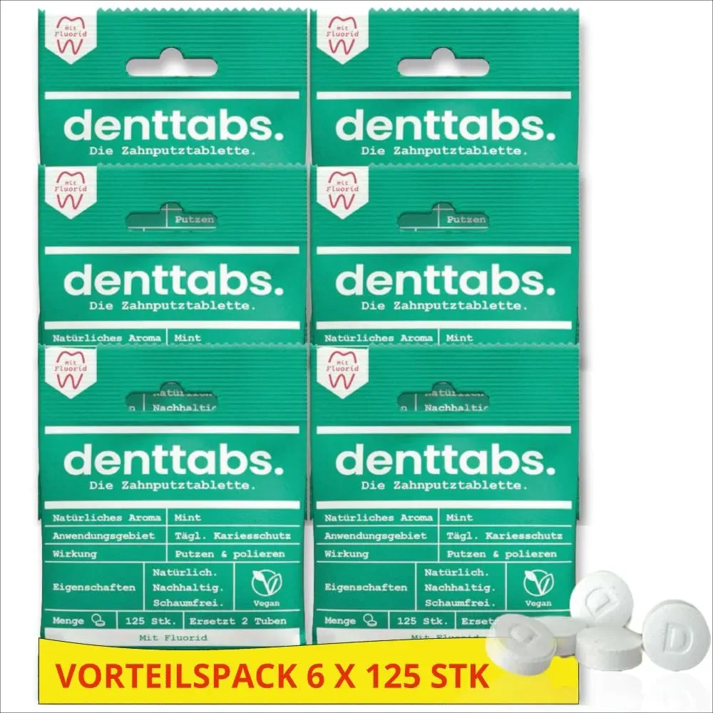 Kategorie: Zahnpflegeartikel - Denttabs - GTIN:7426941120950 - DENTTABS Zahnputz-Tabletten Ohne Fluorid (6 X 125 Stk.), Mild Und Angenehm, Vegan, Naturkosmetik - 29,99 Euro bei Amazon Marketplace Health & Personal Care - gefunden von billiger.de Dieses Angebot ist empfehlenswert, da es einen Jahresvorrat an Denttabs mit Fluorid zu einem attraktiven Preis bietet. ![]() ![]() Denttabs Zahnputztabletten Minze mit Fluorid 6 x 125 Stck. für 1 Jahr. Die vollwertige Alternative zur Zahnpasta. VEGAN Plastikfrei ohne Konservierungsstoffe. ORIGINAL DENTTABS kompostierbare Beutel