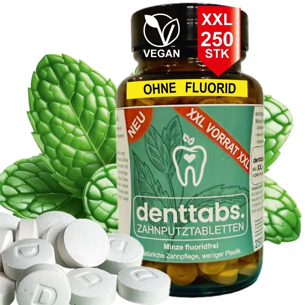 Kategorie: Zahnpflegeartikel - Denttabs - GTIN:0788400052279 - Marke: DENTTABS 125 Denttabs mit Fluorid VEGAN plastikfrei Größe: 1 Stück' - 7,50 Euro bei Amazon Marketplace Health & Personal Care - gefunden von billiger.de Dieses Angebot ist empfehlenswert, da es eine größere Menge fluoridfreier Denttabs im praktischen XXL-Vorratsglas bietet. ![]() ![]() denttabs Zahnpastatabletten Minze fluoridfrei im XXL Vorratsglas 250 Tabs, ausreichend für 4 Monate natürliche Zahnpflege. Die vollwertige Alternative zu herkömmlicher Zahnpasta. VEGAN, ohne Fluorid