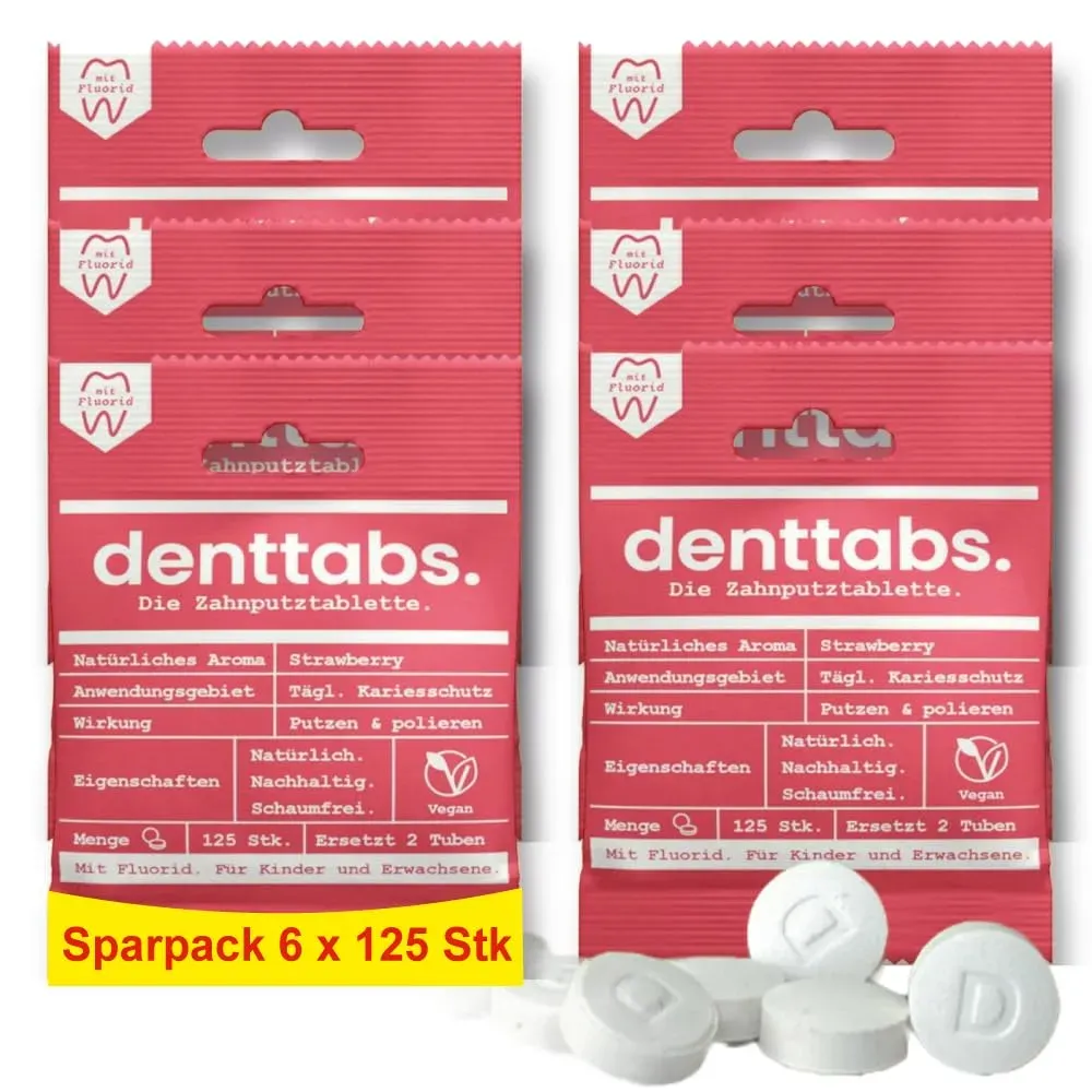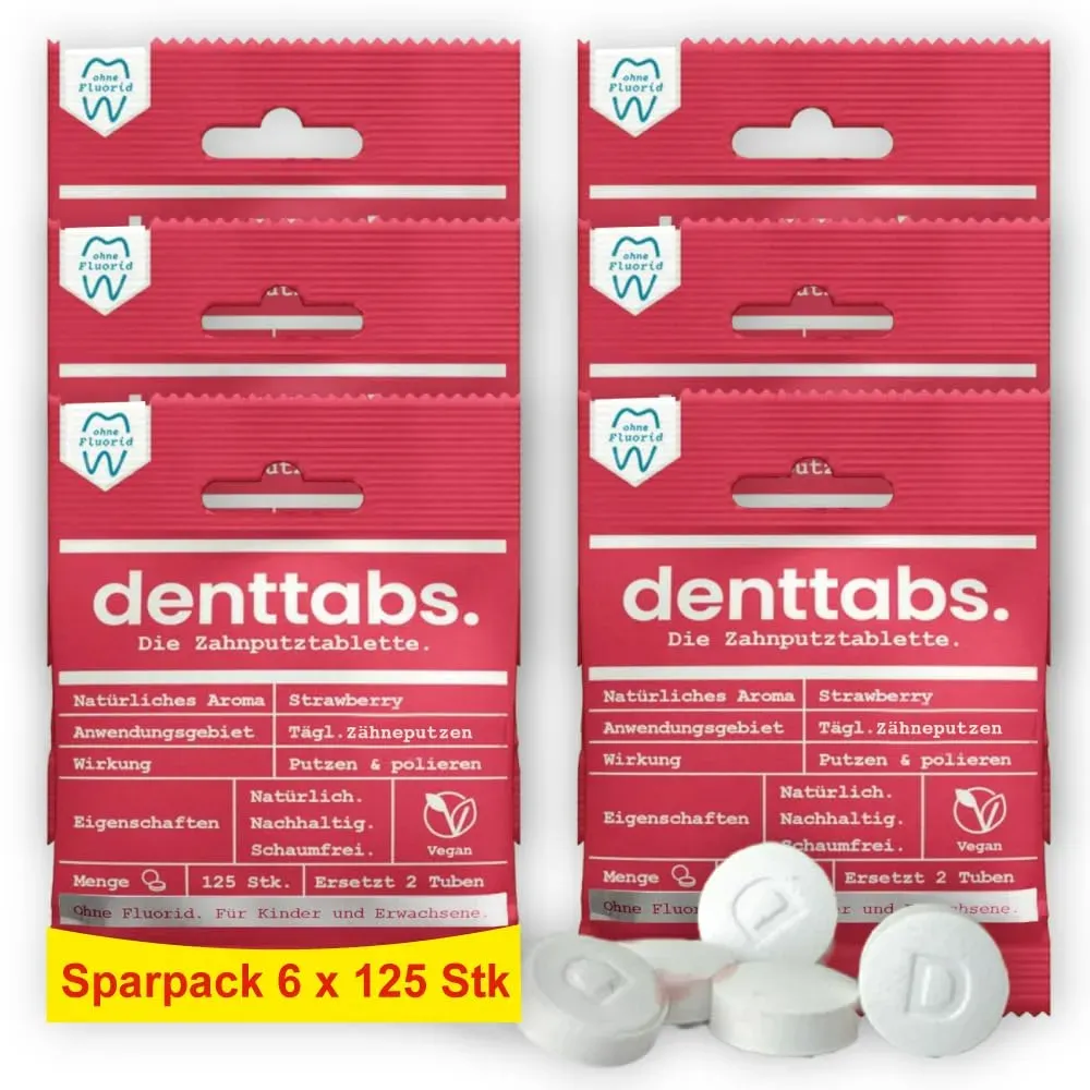 Kategorie: Zahnpflegeartikel - Denttabs - GTIN:7426941120912 - Denttabs Zahnputztabletten Minze mit Fluorid 6 x 125 Stck. für . Die vollwertige Alternative zur Zahnpasta. VEGAN Plastikfrei ohne Konservierungsstoffe. ORIGINAL DENTTABS kompostierbare Beutel - 29,99 Euro bei Amazon Marketplace Health & Personal Care - gefunden von billiger.de Dieses Angebot ist empfehlenswert, da es eine große Packung fluoridfreier Erdbeer-Denttabs für Kinder und Erwachsene bietet. ![]() ![]()