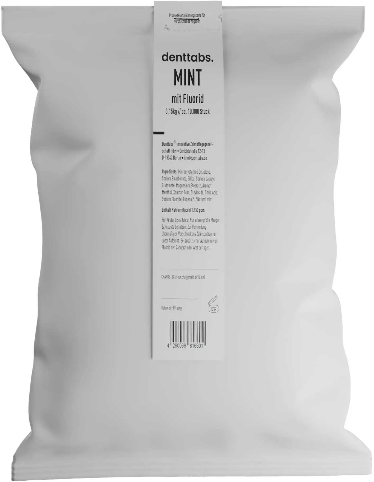 Kategorie: Zahnpflegeartikel - Denttabs - GTIN:4260066816533 - Zahnputztabletten (ca. 3.200 Stück; lose) - 123,00 Euro bei Amazon Marketplace Health & Personal Care - gefunden von billiger.de Dieses Angebot ist empfehlenswert für Großverbraucher oder Familien, da es eine sehr große Bulk-Packung mit Fluorid bietet. ![]() ![]() Denttabs Bulk-Beutel: 3,15kg Mint - mit Fluorid