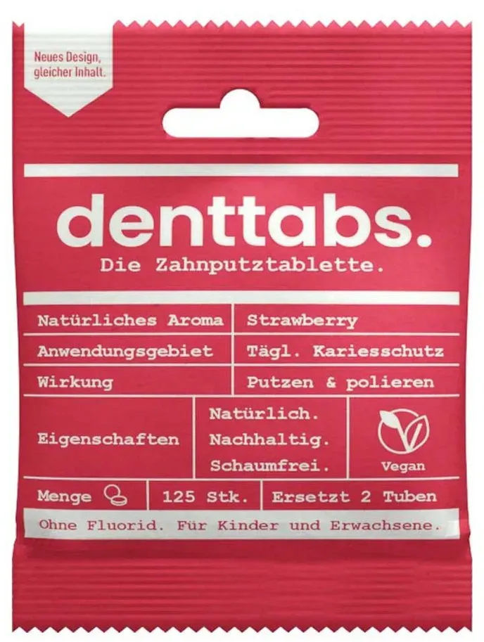 Kategorie: Zahnpflegeartikel - Denttabs - GTIN:4260066813433 - fluoridfrei natürliches Erdbeeraroma sanfte politur für Kinder und Erwachsene geeignet Verpackung Kompostierbar frei von Konservierungsstoffen - 6,99 Euro bei Amazon Marketplace Beauty - gefunden von billiger.de Dieses Angebot ist empfehlenswert, da es eine Standardpackung mit Fluorid in kompostierbarem Beutel für 2 Monate Nutzung bietet. ![]() ![]() Denttabs Zahnputztabletten die vollwertige Alternative zur Zahnpasta, 125 Stk. für 2 Monate. Mint mit Fluorid - VEGAN Plastikfrei ohne Konservierungsstoffe. Im Orginal denttabs kompostierbaren Beutel