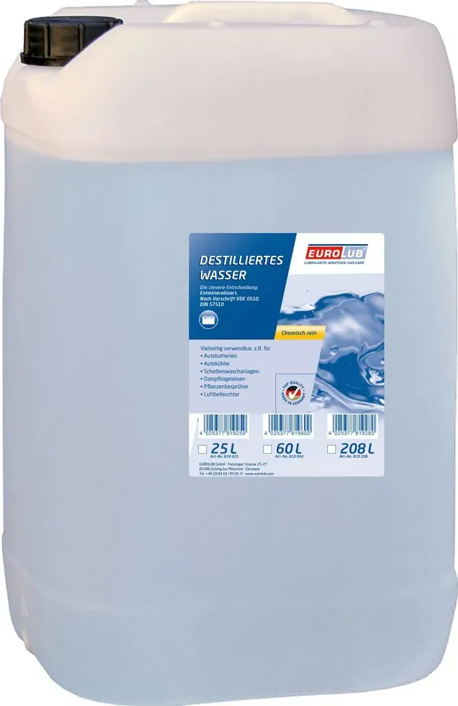 Kategorie: Medizinischer Bedarf - Medicalcorner24 - GTIN:4251240834061 - bidestilliertes Wasser, Reinstwasser 1 Liter Leitwert: 0,2 S/cm beim Abfüllen niedrige Leitfähigkeit von Medicalcorner24 - 7,65 Euro bei Amazon Marketplace Home Improvement - gefunden von billiger.de Dieses 25-Liter-Angebot ist eine kostengünstige Lösung für GroÃ?verbraucher. ![]() ![]() EUROLUB Destilliertes Wasser 25 L