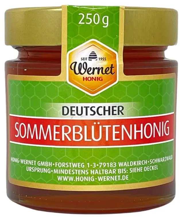 Verfügbarkeit: 1-2 Werktage - 23,32 €/kg - Kategorie: Honig - honig wernet - GTIN:4002918143103 - Deutscher Sommerblüten HonigDeutscher Sommerblütenhonig von Wernet €“ Ein zarter Genuss aus dem SchwarzwaldDer deutsche Sommerblütenhonig von Wernet vereint die Aromen blühender Wiesen und Felder im Schwarzwald und bringt sie direkt zu Ihnen nach Hause. Hergestellt von einem traditionsreichen Imkerbetrieb, überzeugt dieser Honig durch seine natürliche Qualität und den authentischen Geschmack, der nur aus einer nachhaltigen und handwerklichen Imkerei stammen kann. Im 250g Glas erhalten Sie einen milden, blumigen Honig, der sich perfekt für den täglichen Genuss eignet.Warum Sommerblütenhonig?Sommerblütenhonig ist besonders vielseitig und mild im Geschmack. Die Bienen sammeln Nektar von einer Vielzahl blühender Pflanzen, die im Sommer ihre volle Pracht entfalten. Das Ergebnis ist ein harmonischer, leichter Honig, der sowohl von Erwachsenen als auch von Kindern geliebt wird. Der Sommerblütenhonig von Wernet hat eine klare goldene Farbe und ein dezentes, blumiges Aroma, das ihn ideal für den täglichen Gebrauch macht.Ihr Vorteil: Ein milder und vielseitiger HonigDer Sommerblütenhonig von Wernet eignet sich perfekt als Brotaufstrich, zum Süßen von Tees oder als feine Zutat in verschiedenen Gerichten und Desserts. Sein milder Geschmack passt zu vielen Speisen und Getränken und macht ihn besonders vielseitig einsetzbar.Traditionelle Qualität aus dem ... Dieser cremige Lindenhonig von Honig Wernet ist eine weitere beliebte Sorte, die für ihren charakteristischen Geschmack geschätzt wird. ![]() ![]() Honig Wernet Traditionsimker im Schwarzwald Deutscher Lindenhonig cremig 250g Glas