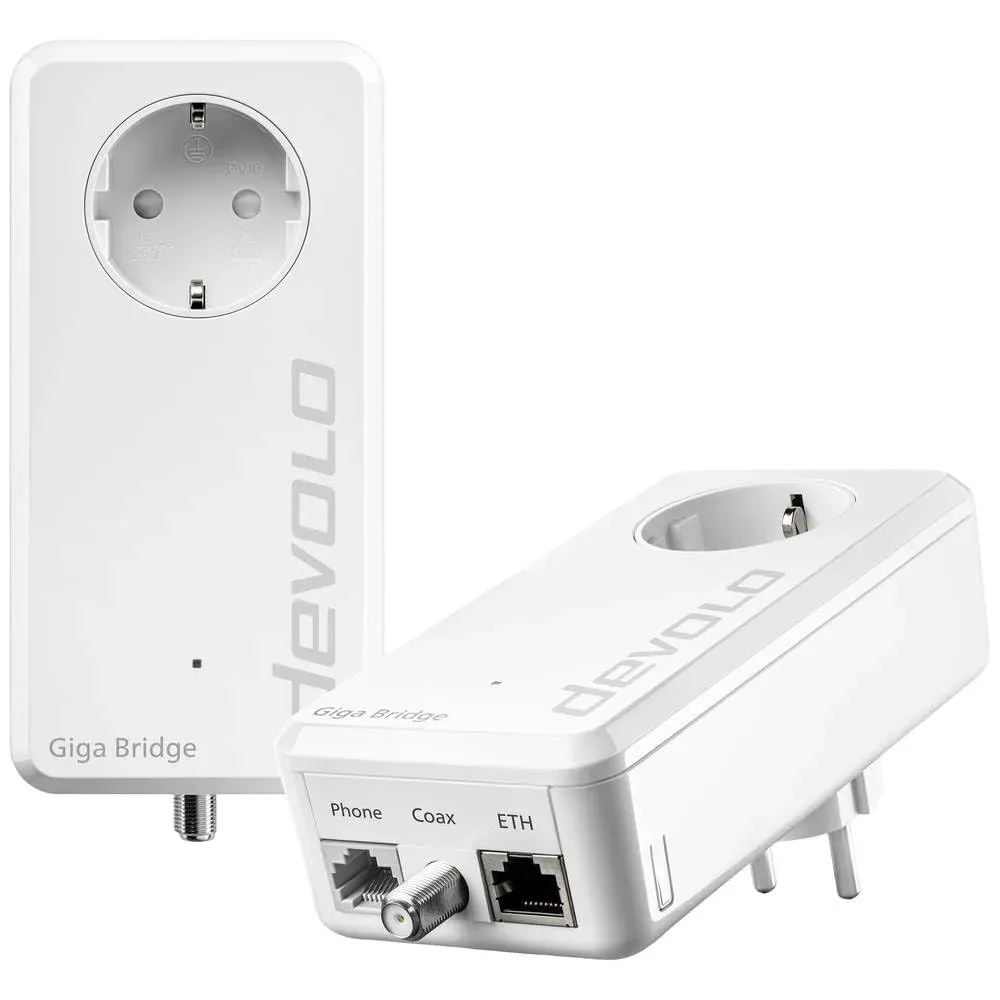 EAN: 4250059688605 - Erleben Sie mit dem Devolo Giga Bridge Coax Gigabit-Geschwindigkeit in Ihrem Zuhause. Ideal für Glasfaseranschlüsse, bietet dieses Power LAN stabile Verbindungen und eine hohe Reichweite. Die einfache Installation im Wohnbereich ermöglicht es Ihnen, das volle Potenzial Ihrer Internetverbindung auszuschöpfen. Genießen Sie eine zuverlässige Performance, die sich perfekt für Streaming, Gaming und Home Office eignet. Mit dem Devolo Giga Bridge Coax bringen Sie Ihr Netzwerk auf das nächste Level. Devolo Giga Bridge Coax Starter-Set - Ethernet - 1.000 Mbps - Ethernet - Anrufbeantworter - bei kaufland.de - aus Yadore Produktdaten ![]() Devolo Giga Bridge Coax (1000 Mbit/s), Powerline