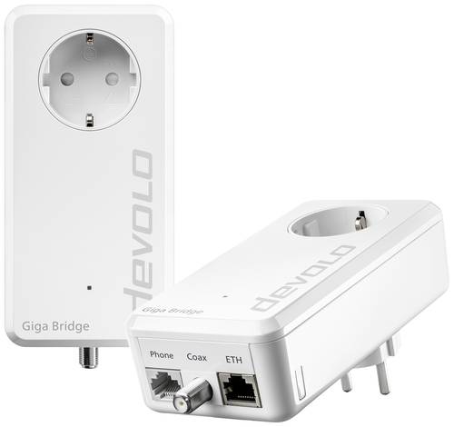 Gesamtsortiment IT + Multimedia Netzwerk Bridges + Router Access Point Zugangspunkte - EAN:4250059698550 - Das devolo GigaGate bringt die Kraft des Internets genau dorthin, wo du sie nutzen willst. Mit einer gigantischen Sendeleistung von bis zu 2 Gbit/s stellt die WLAN-Bridge eine punktgenaue WLAN-Verbindung her, die das Internet mit konstant hoher Geschwindigkeit zu den Endgeräten bringt. Dazu schliesst du deine Multimedia-Geräte einfach und sicher über fünf verfügbare LAN-Anschlüsse an: Für den Anschluss von Hochleistungsgeräten bietet das GigaGate einen Highspeed-Gigabit-Port, weitere kabelgebundene Multimedia-Geräte können über vier Fast-Ethernet-Ports angeschlossen werden. Darüber hinaus werden mobile Geräte wie Smartphones, Tablets und Co. über einen zusätzlichen WLAN-Access-Point mit reichweitenstarkem Internet versorgt. - gefunden von Kelkoo Dieser Erweiterungsadapter ist eine kostengünstige Option, um ein bestehendes Giga Bridge Coax System zu erweitern. ![]() ![]() bitte lesen! - devolo Giga eBay Bridge Coax Erweiterungsadapter