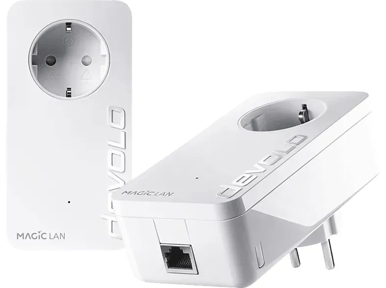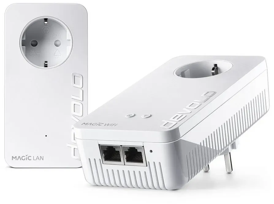 Kategorie: Powerline - devolo - GTIN:4250059682603 - Vorteile im überblick Ultraschnelle Powerline-Adapter für uneingeschränkten Gaming- und Streaming-Spaß. Bis zu 2.400 Mbit/s übertragungsrate mit G.hn-Technologie. Hochgeschwindigkeits-Heimnetzwerk über die Stromleitung vom Powerline-Pionier. 1x Gigabit-LAN-Anschluss für Smart-TV, Spiele-Konsole oder Computer. Set mit 2 Adaptern zum Aufbau eines Magic-Powerline-Netzwerks. Highspeed-Internet aus der Steckdose Der devolo Magic 2 LAN verteilt Ihr Internetsignal mit Highspeed in Ihrem Zuhause, vom Keller bis ins Dachgeschoss, ganz einfach über die Stromleitung. Stecken Sie die devolo Magic-Adapter ein, warten kurz bis die Adapter sich automatisch verbunden haben und schon empfangen Sie zuverlässiges Internet mit bis zu 2.400 Mbit/s an jeder Steckdose. An alles gedacht Der devolo Magic 2 LAN ist mit der G.hn-Technologie zukunftssicher. über den Gigabit-LAN-Anschluss können Sie verschiedenste stationäre Endgeräte ob Smart-TV, Spielkonsole oder Computer an den devolo Magic-Adapter anschließen. Streamen Sie die neuesten Blockbuster ohne lästige Aussetzer, ultra-scharf gestochen und in brillanter Auflösung. Tauchen Sie beim Online-Gaming in abenteuerliche Multiplayer-Schlachten ein, zum Greifen realistisch. Plug-and-play Dank des smarten Plug-and-play kommt stabiles Internet aus der Steckdose ohne komplizierte Konfiguration im Nu dorthin, wo Sie möchten. Einfach einstecken und loslegen! Und Sie haben alles unter Kontrolle, denn ... Ein Starter Kit der Magic 2 WiFi next Serie, das schnelles WLAN und Powerline-Technologie kombiniert. ![]() ![]() devolo Magic 2 WiFi next Starter Kit 2400 Mbps 2 Adapter 8614