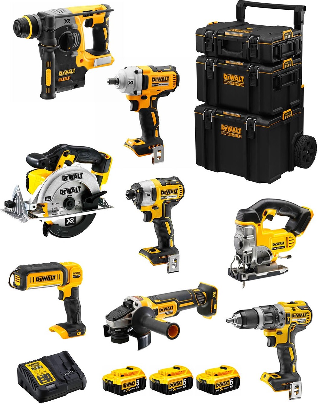 DEWALT - EAN: 8435587919117 - Allgemeine Beschreibung Das DeWALT Kit DWK901T ist ein umfassendes Set, das eine Vielzahl leistungsstarker Werkzeuge für professionelle Anwendungen im Bereich Bau und Renovierung umfasst. Es beinhaltet den Schlagbohrschrauber DCD996, den Kombihammer DCH273, den Mini-Winkelschleifer DCG405, die Schlagschrauber DCF887 und DCF894, die Pendelhub-Stichsäge DCS334, die Handkreissäge DCS570, die Säbelsäge DCS367 sowie die LED-Taschenlampe DCL050. Das Set wird mit drei 5,0 Ah Batterien und einem DCB115 Ladegerät geliefert und ist ideal für anspruchsvolle DIY- und Handwerksprojekte. Technische daten Schlagbohrschrauber DCD996: max. Schlagfrequenz 38.250 i.p.m., 3 Geschwindigkeiten, 22 Drehmomentpositionen Kombihammer DCH273: Bohrleistung in Beton von 4 bis 24 mm, Vibration 6,6 m/s Mini-Winkelschleifer DCG405: Bürstenloser Motor, elektronische Bremse Schlagschrauber DCF887: Drehmoment bis zu 205 Nm, 3 Geschwindigkeiten Schlagschrauber DCF894: Drehmoment bis zu 447 Nm, 3.100 Schläge pro Minute - bei manomano.de - aus Yadore Produktdaten Dieses Kit ist eine gute Option für Anwender, die ein umfangreiches Set mit mehreren Werkzeugen und Zubehör suchen, inklusive des DCF894. ![]() ![]() Kit DWK800 (DCD796 + DCH273 + DCG405 + DCF887 + DCF894 + DCS331 + DCS391 + DCL050 + 3 Batterien 5,0 Ah + Ladegerät + Caddy 3en1)