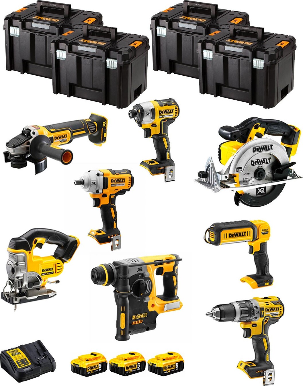 EAN: 8435587917038 - DeWALT Kit DWK800 Schlagbohrschrauber DeWALT DCD796- Motor mit bürstenloser Technologie für exzellenten Wirkungsgrad- Das ultrakompakte und leichte Design ermöglicht den Einsatz auf engstem Raum- Schraubendreher- und Bohrhammerfunktion für mehrere Anwendungen- Zwei variable und reversible Geschwindigkeiten mit Vollmetallgetriebe für mehr Autonomie und längere Standzeit- 15 einstellbare Anzugsmomentpositionen für präzise Schraubergebnisse bei einer Vielzahl von Materialien- Intelligenter und effizienter Trigger, der die vollständige Kontrolle über alle Anwendungen ermöglicht- 3-Positionen-LED-Licht (hoch / mittel / niedrig) mit Verzögerungsfunktion zur Verbesserung der Sichtbarkeit und Funktionalität- Das verbesserte Griffdesign bietet eine verbesserte Anwendungskontrolle und maximalen Komfort- Gürtelclip und Magnetspitzenretention sorgen für hervorragende AufbewahrungslösungenKombihammer DeWALT DCH273- Bürstenloser Motor und bietet eine längere Lebensdauer und maximale Autonomie- Rotationsstopp für leichte Anwendungen des Meißelns in Gips und Fliesen; und Impact Stop zum Bohren von Holz, Keramik oder Metall- Elektronische Kupplung für besseres Drehmoment und maximale Haltbarkeit- Hellweißes LED-Licht mit Verzögerungsfunktion zur Verbesserung der Sichtbarkeit und Funktionalität- Kompaktes, leichtes und ergonomisches Design für mehr Komfort und Unterstützung bei langen Arbeitszeiten- Ideal zum Bohren von Ankern in Beton und Ziegel von 4 bis 24 ... Dieses Kit ist eine umfassende Lösung mit vielen Werkzeugen und TSTAK-Boxen, ideal für professionelle Anwender, die eine komplette Ausstattung benötigen. ![]() Dewalt - Kit DWK901T (DCD996 + DCH273 + DCG405 + DCF887 + DCF894 + DCS334 + DCS570 + DCS367 + DCL050+ 3x5,0Ah +DCB115+ 4xTSTAK vi)