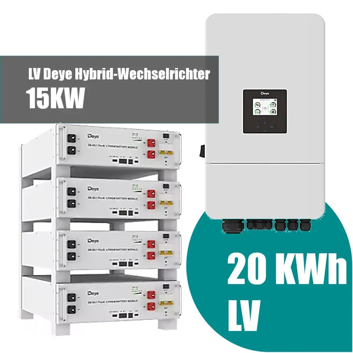 7 Werktage pre_order - 15kW Sets Niedervolt Solarenergie - SUN-16K-SG05LP3-EU-SM2 DEYE SUN-16K-SG05LP3-EU-SM2 Hybridwechselrichter Leistungsstarker Dreiphasen-Hybridwechselrichter Der SUN-16K-SG05LP3-EU-SM2 ist ein innovativer dreiphasiger Hybridwechselrichter, der speziell für höchste Effizienz und Vielseitigkeit entwickelt wurde. Mit einer maximalen Lade- und Entladekapazität von 350 A und der Fähigkeit, Energie von Dieselgeneratoren zu speichern, stellt er eine ideale Lösung für moderne Energieverwaltungssysteme dar. Die Möglichkeit, bis zu 10 Geräte parallel zu betreiben, sowohl im Netzbetrieb als auch im Inselbetrieb, sorgt für maximale Flexibilität. Zudem unterstützt er mehrere parallele Batteriesysteme und verfügt über ein intelligentes Design, das sich optimal an bestehende Solarsysteme anpassen lässt. Intelligente Energieverwaltung und umfassender Schutz Mit sechs programmierbaren Zeitfenstern für das Laden und Entladen von Batterien bietet der Wechselrichter eine außergewöhnliche Kontrolle über die Energiespeicherung und -nutzung. Sein fortschrittliches Schutzsystem umfasst Überstrom-, Überspannungs-, Kurzschluss- und Erdschlussschutz sowie die Überwachung von Lichtbogenfehlern und Restströmen. Zusätzlich sorgt die Isolationsüberwachung der Gleichstromanschlüsse für ein Höchstmaß an Sicherheit. Der SUN-16K-SG05LP3-EU-SM2 ist mit einem robusten Gehäuse ausgestattet, das Schutzart IP65 entspricht, und kann in einem Temperaturbereich von -40 bis +60 °C betrieben ... Dieses Komplettset ist empfehlenswert, da es einen 16 kW Hybridwechselrichter mit einem 10,2 kWh Deye RW-F10.2 LFP Batteriespeicher zu einem guten Preis anbietet, wenn etwas mehr Leistung benötigt wird. Solarscout s.de Komplettset 16 kW Hybridwechselrichter SUN-16K-SG05LP3-EU-SM2 & 10,2 kWh Batteriespeicher Deye RW-F10.2 LFP
