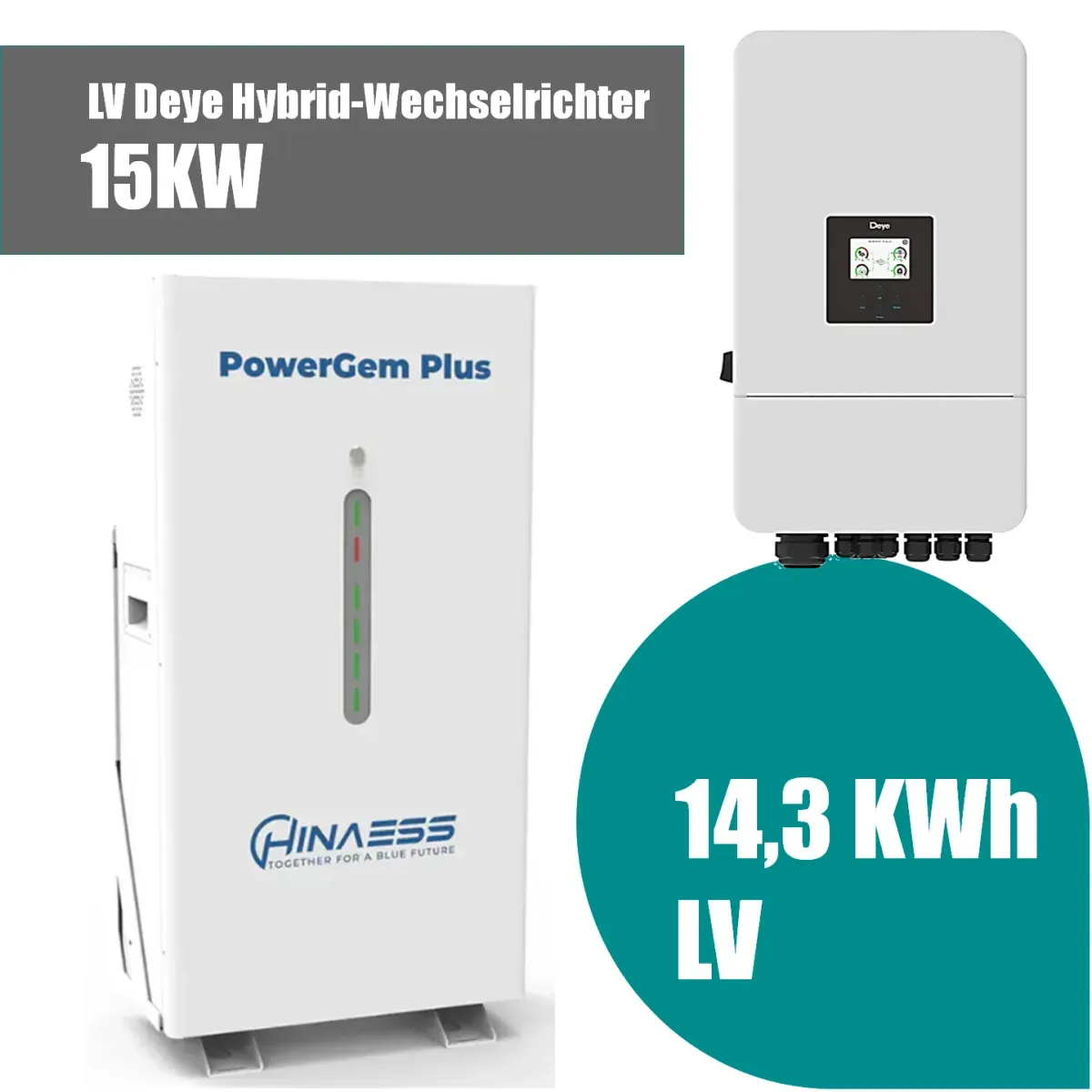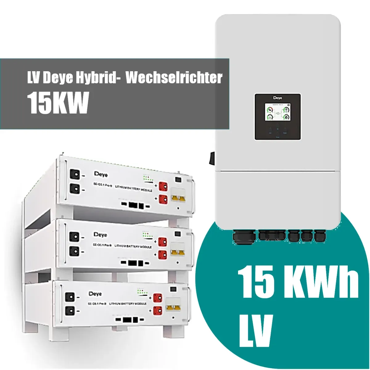 Kategorie: Stromspeicher - DEYE - GTIN:4262408221135 - SUN-15K-SG05LP3-EU-SM2 DEYE SUN-15K-SG05LP3-EU-SM2 Hybridwechselrichter Leistungsstarker Dreiphasen-Hybridwechselrichter Der SUN-15K-SG05LP3-EU-SM2 ist ein innovativer dreiphasiger Hybridwechselrichter, der speziell für höchste Effizienz und Vielseitigkeit entwickelt wurde. Mit einer maximalen Lade- und Entladekapazität von 350 A und der Fähigkeit, Energie von Dieselgeneratoren zu speichern, stellt er eine ideale Lösung für moderne Energieverwaltungssysteme dar. Die Möglichkeit, bis zu 10 Geräte parallel zu betreiben, sowohl im Netzbetrieb als auch im Inselbetrieb, sorgt für maximale Flexibilität. Zudem unterstützt er mehrere parallele Batteriesysteme und verfügt über ein intelligentes Design, das sich optimal an bestehende Solarsysteme anpassen lässt. Intelligente Energieverwaltung und umfassender Schutz Mit sechs programmierbaren Zeitfenstern für das Laden und Entladen von Batterien bietet der Wechselrichter eine außergewöhnliche Kontrolle über die Energiespeicherung und -nutzung. Sein fortschrittliches Schutzsystem umfasst überstrom-, überspannungs-, Kurzschluss- und Erdschlussschutz sowie die überwachung von Lichtbogenfehlern und Restströmen. Zusätzlich sorgt die Isolationsüberwachung der Gleichstromanschlüsse für ein Höchstmaß an Sicherheit. Der SUN-15K-SG05LP3-EU-SM2 ist mit einem robusten Gehäuse ausgestattet, das Schutzart IP65 entspricht, und kann in einem Temperaturbereich von -40 bis +60 C betrieben werden. ... Dieses Komplettset ist empfehlenswert, da es den 15 kW Hybridwechselrichter mit einem 14,3 kWh HINAESS PowerGem Plus Niederspannung Batteriespeicher zu einem attraktiven Preis mit 0% MwSt. anbietet. ![]() ![]() Deye Komplettset 15 kW Hybridwechselrichter (Deye SUN-15K-SG05LP3-EU-SM2) & HINAESS PowerGem Plus Niederspannung Batteriespeicher, 14.3kWh - 0% MwSt. (gem. 12 Abs. 3 UStG)