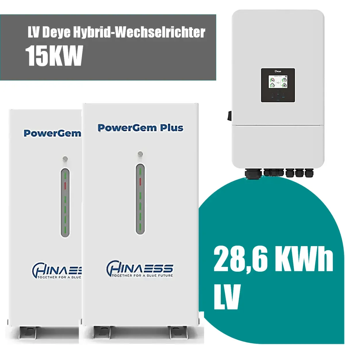 Kategorie: Stromspeicher - DEYE - GTIN:4262408221135 - Intelligenter Hybrid-Wechselrichter für dreiphasige PV-Anlagen Der Deye SUN-15K-SG05LP3-EU-SM2 ist ein leistungsstarker Hybrid-Wechselrichter, konzipiert für moderne Photovoltaikanlagen mit hohem Energiebedarf. Mit einer Ausgangsleistung von 15 kW eignet sich dieses Modell ideal für Wohn- und Gewerbeanwendungen. Es ermöglicht nicht nur die direkte Versorgung des Stromverbrauchs, sondern auch die effiziente Speicherung überschüssiger Energie in Batteriesystemen oder die Rückspeisung ins Netz. Die Kombination aus Flexibilität, Effizienz und Sicherheit macht diesen Wechselrichter zur idealen Lösung für nachhaltige Energieprojekte. Höchste Effizienz und flexible Energieverteilung Ausgestattet mit zwei MPP-Trackern und der Fähigkeit zur vollständigen Phasenunsymmetrie, erlaubt der Deye SUN-15K eine flexible Verteilung der Leistung auf die drei Phasen jede Phase kann dabei bis zu 50?% der Nennleistung unabhängig abgeben. Damit eignet sich das Gerät perfekt für anspruchsvolle Lastprofile. Der Wechselrichter ist mit 48?V Niedervolt-Batterien kompatibel und passt sich dank intelligenter BMS-Kommunikation automatisch an die jeweilige Batterietechnologie an. Robustes Design mit umfassendem Schutzkonzept Durch die Schutzklasse IP65 ist der Wechselrichter auch für den Außeneinsatz bestens gerüstet. Integrierte Sicherheitsfunktionen wie Verpolungsschutz (DC), überstrom- und überspannungsschutz sowie Kurzschluss- und ... Dieses Komplettset ist empfehlenswert, da es den 15 kW Hybridwechselrichter mit einem sehr großen 28,6 kWh HINAESS PowerGem Plus Niederspannung Batteriespeicher zu einem guten Preis mit 0% MwSt. anbietet. ![]() ![]() Deye Komplettset 15 kW Hybridwechselrichter (Deye SUN-15K-SG05LP3-EU-SM2) & HINAESS PowerGem Plus Niederspannung Batteriespeicher, 28.6kWh - 0% MwSt. (gem. 12 Abs. 3 UStG)