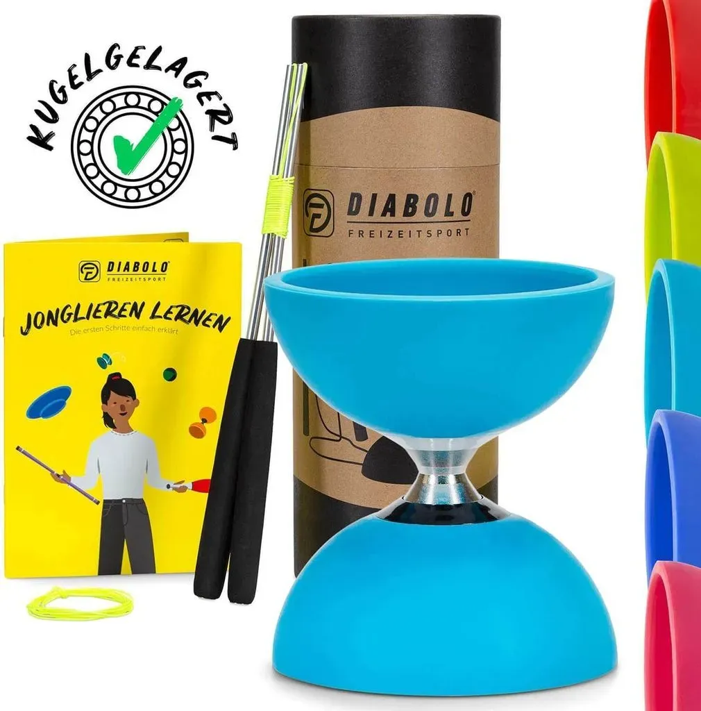 Kategorie: Akrobatik - Henrys - GTIN:4022507171850 - Großes Diabolo 13 cm, ca. 230 g mit transparenten Halbschalen für eine tolle Optik, farbig sortiert. Eigenschaften: - Farbe: farblich sortiert - Gewicht: 0,23 kg - Sportart: Freizeit - 31,95 Euro bei Kübler Sport - gefunden von billiger.de Ein Diabolo Set Pro mit kugelgelagerter Achse, das sich gut für fortgeschrittene Tricks und längere Spielzeiten eignet. ![]() ![]() Diabolo Freizeitsport Diabolo Set Pro (türkis) mit kugelgelagerter Achse - inkl. Alu-Handstäben, Ersatzschnur, Anleitung und Geschenkverpackung