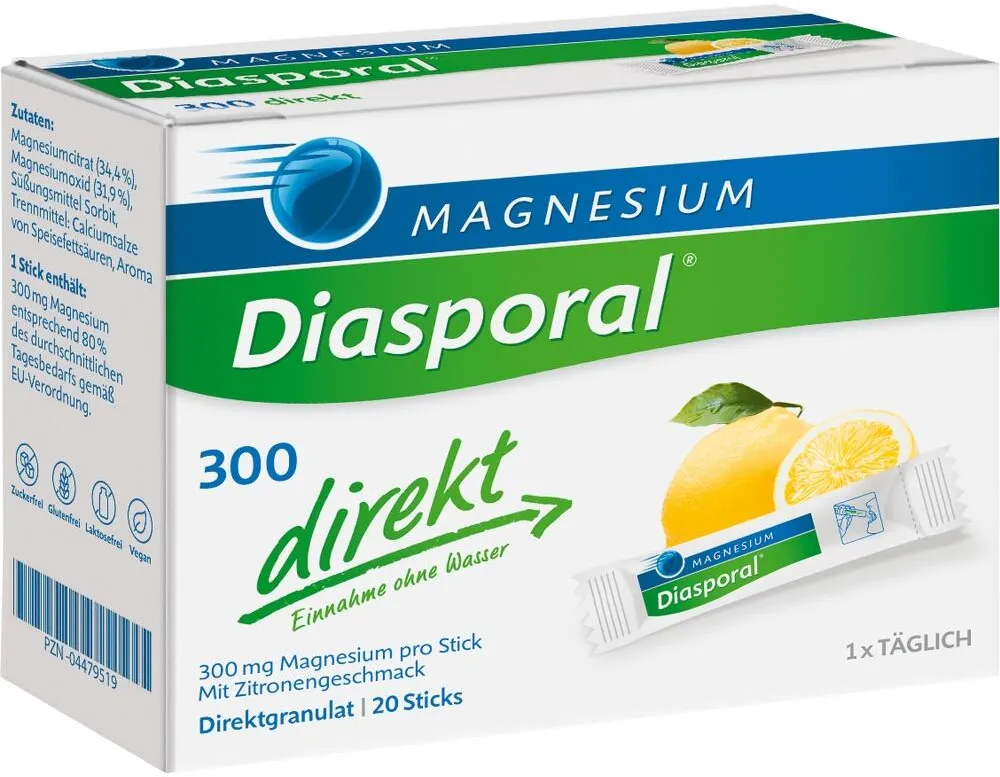 0,39 /St - Kategorie: Arzneimittel - Diasporal - GTIN:4260124360343 - PZN:04479519 - Schnell und direkt: ideal für Aktive und für unterwegsDas Direktgranulat kann schnell und ohne Flüssigkeit eingenommen werden und löst sich direkt im Mund.- Direktgranulat mit 300 mg Magnesium pro Stick- Erfrischender Zitronengeschmack- Nur 1 x täglich- Ohne Zucker, ohne künstliche Süßstoffe- Hinweis für Diabetiker: 1 Stick enthält weniger als 0,1 Broteinheiten- Glutenfrei, laktosefreiInhaltsstoffe: körperfreundliches Magnesiumcitrat mit MagnesiumoxidNahrungsergänzungsmittel mit Süßungsmittel Sorbit zur Unterstützung der Magnesiumversorgung. Kann beiübermäßigem Verzehr abführend wirken.Zutaten: Magnesiumcitrat (34,4 %), Magnesiumoxid (31,9 %), Zuckeraustauschstoff Sorbit, Trennmittel:Calciumsalze von Speisefettsäuren, Aroma - 7,77 Euro bei medpex.de - gefunden von billiger.de Ein beliebtes Angebot für 50 Stück Granulat von einer großen Online-Apotheke. ![]() ![]() Magnesium Diasporal 300 mg Granulat 50 St