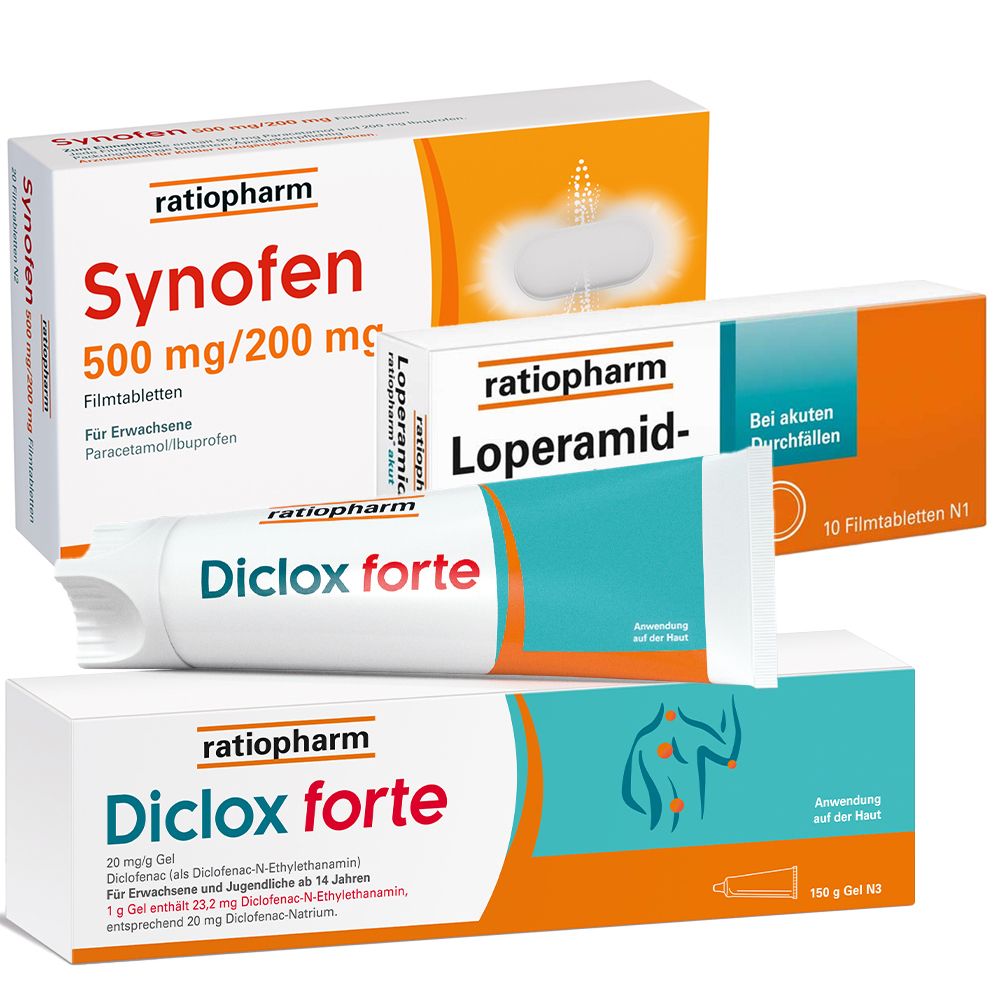 23.27 eur / 1 ct - Sonstige - EAN:4150081092190 - Synofen 500 mg/200 mg + Diclox forte Schmerzgel 2 % + Loperamid-ratiopharm R akut Dieses Set besteht aus: 1 x Synofen 500 mg/200 mg, 20 Filmtabletten 1 x Diclox forte Schmerzgel 2 %, 150 g 1 x Loperamid-ratiopharm R akut, 10 Filmtabletten Synofen 500 mg/200 mg Schnell, stark und gut verträglich: Synofen mit dem 3-fach-Effekt gegen Schmerzen Werden Sie im Alltag von Schmerzen wie zum Beispiel Kopfschmerzen, Rückenschmerzen, Gelenkschmerzen oder Zahnschmerzen überrascht, sollen diese effektiv gelindert werden. Das Schmerzmittel Synofen von ratiopharm kombiniert 500 mg Paracetamol und 200 mg Ibuprofen in einer Tablette, wodurch es stärker wirkt als vergleichbare Dosen der einzelnen Wirkstoffe. Schon nach 15 Minuten* tritt eine spürbare Schmerzlinderung ein, die mindestens 8 Stunden* anhält. Ein weiterer Vorteil von Synofen ist die gute Verträglichkeit. Beide Wirkstoffe werden in einer niedrigen Einzeldosierung eingesetzt, wodurch nur ein niedriges Risiko für Neben- und Wechselwirkungen entsteht. Die neuen Schmerztabletten von ratiopharm sind für Erwachsene und Jugendliche ab 1 n geeignet. Synofen: die Kombination aus Paracetamol und Ibuprofen in einer Schmerztablette Paracetamol und Ibuprofen haben sich als Einzelwirkstoffe bei der Behandlung von Schmerzen bewährt. In vielen Schmerzmitteln wird allerdings nur ein Wirkstoff verwendet. Jedoch kann die Kombination zweier Wirkstoffe diverse Vorteile mit sich bringen. Synofen von ... ![]() Hausapotheke Set Synofen 500 mg/200 mg Filmtabletten, LOPERAMID-ratiopharm akut 2 Filmt 1 St