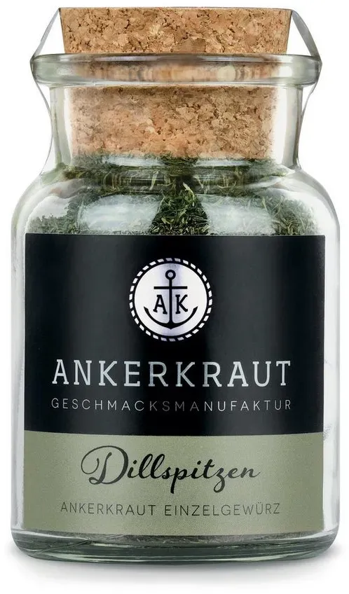 ? Was sind Dillspitzen?Dillspitzen sind die feinen, aromatischen Spitzen der Dillpflanze, die vor der Blüte geerntet und getrocknet werden. Sie haben ein frisches, leicht süßliches Aroma mit Anklängen an Anis, Minze und Fenchel und eignen sich besonders für Fischgerichte, Salate, Saucen und Dips.