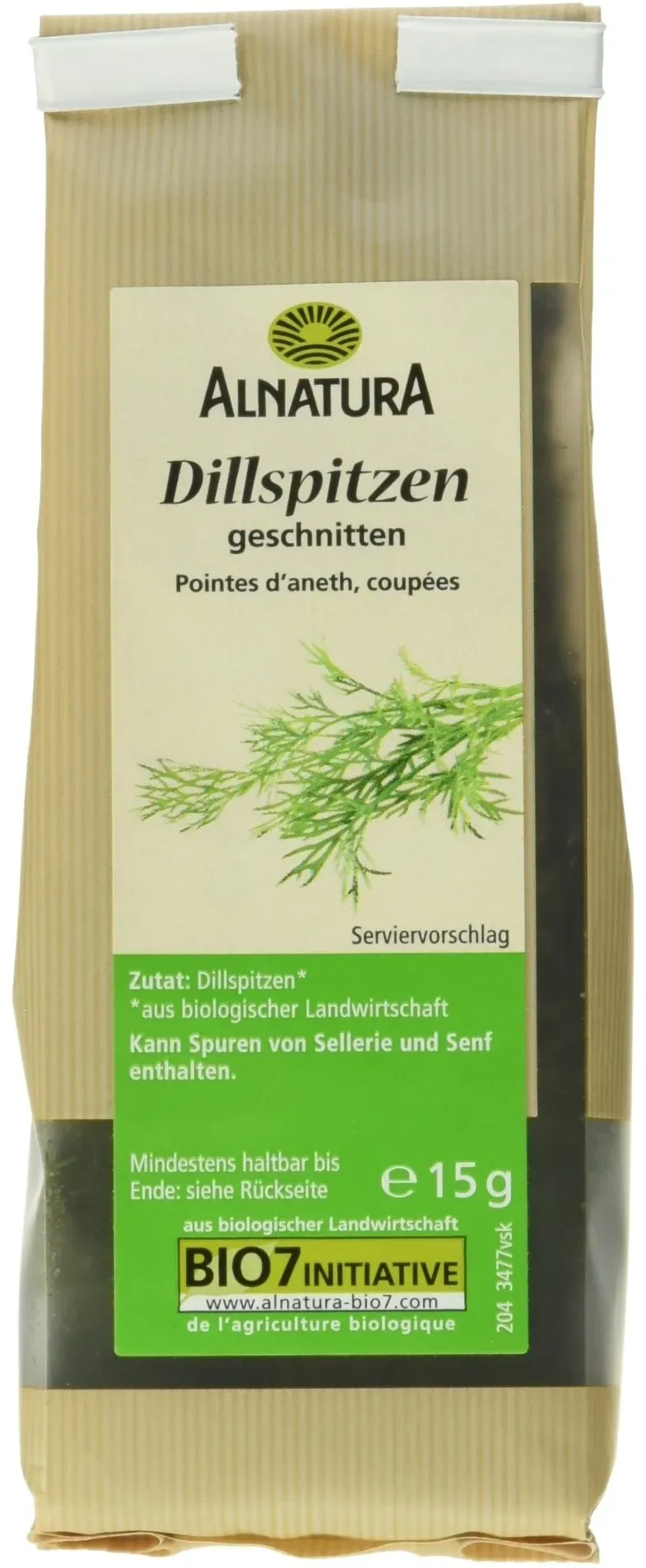3 Händlerangebote bei billiger.de - Kategorie: Kräuter & Gewürze - Alnatura - Schonend Verarbeitet Intensives Aroma Besonders Gut Erhalten Ideal Für Salate, Dips Und Fischgerichte Zum Würzen Von Fisch Und Hellem Fleisch, In Salatdressings Und Sanften Kräutersaucen; Wichtige Zutat Für Eingelegte Gurken Vielseitiges Gewürzkraut Mit Erfrischend-Mildem, Leicht Kümmelartigem Geschmack - GTIN:4104420028289 Dieses Produkt bietet ein gutes Preis-Leistungs-Verhältnis für Bio-Dillspitzen. ![]() ![]() Lebensbaum Dillspitzen - geschnitten und getrocknet