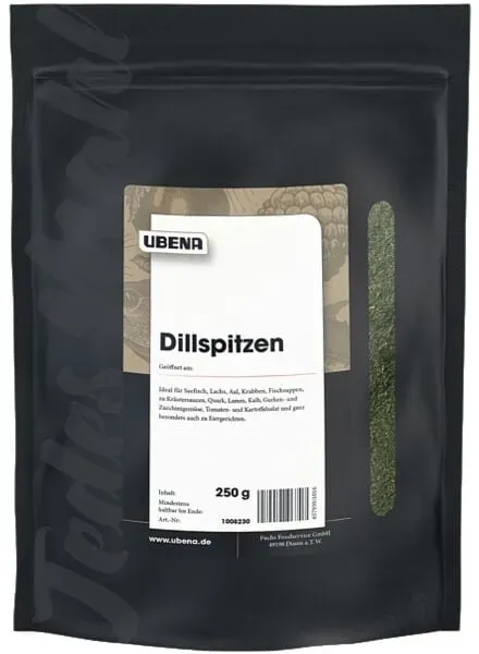 Feinschmecker Lifestyle - - UBENA Dillspitzen - feines Kräuteraroma für Fisch, Salate mehr Frisch-würziger Geschmack für vielfältige Gerichte. Die Dillspitzen von UBENA überzeugen durch ihren angenehm milden, leicht süßlichen Geschmack mit typischer Dillnote. Ob in Gurkensalat, Fischgerichten, Saucen oder Eierspeisen - dieses klassische Küchenkraut verleiht Speisen eine frische, kräuterige Nuance und bringt natürliche Aromen perfekt zur Geltung. Professionelle Vorratspackung für Großküchen Die 250 g-Großpackung eignet sich hervorragend für Gastronomiebetriebe, Caterer oder Hobbyköche mit hohem Kräuterbedarf. Die schonend getrockneten Dillspitzen bleiben dank des wiederverschließbaren Aromabeutels lange frisch und behalten ihre feine Struktur sowie das charakteristische Aroma. Einfach anzuwenden vielseitig kombinierbar Dillspitzen passen besonders gut zu Joghurt-Dips, Senfsaucen, Räucherlachs oder Kartoffelgerichten. Sie lassen sich leicht dosieren, harmonieren mit Zitrone, Knoblauch oder Meerrettich und sind ein Muss für die frische Sommerküche.Jetzt UBENA Dillspitzen, 250 g, online kaufen und feine Kräuternoten in Ihre Gerichte bringen! - Versandkostenfrei: false - - - bei Büroshop24 - gefunden von shopping24 Dieses Produkt ist eine gute Wahl für eine größere Menge von einer bekannten Marke in einem wiederverschließbaren Beutel. ![]() ![]()