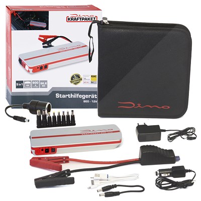 14 Händlerangebote bei billiger.de - Kategorie: Sonstiges Autozubehör - Dino Kraftpaket - Das Kraftpaket mit bärenstarken 18 Ah Kapazität & 600 A Spitzenstrom zum Starten aller Dieselmotoren bis 7.5 L & Benziner bis 8 L Hubraum. Integrierte Powerbank zum Aufladen von u.a. Kameras, Laptops, Mobiltelefonen, Notebooks, Navigationsgeräten, Smartphones, mobile Spielekonsolen, Tablets und zum Betreiben von 12-Volt-Autozubehör mit Netzteil wie Luftkompressoren oder Kühlboxen. Der umfangreiche Lieferumfang besteht aus Starthilfekabel, Ladekabel & Adapterset und sind gemeinsam mit dem Gerät in einer verschließbaren Tasche verpackt. Um einen fehlerhaften Anschluss zu vermeiden, bietet die Dino Starthilfe eine Sicherheitstechnologie mit Verpolungsschutz, Tiefenentladeschutz, überladeschutz, Unterspannungswarnung und & intelligentem Starthilfekabel. Die integrierte LED-Lampe mit drei Funktionen lässt Sie dabei nicht im Dunkeln stehen. Das Kraftpaket ist ideal für Anwender die nur ein Gerät für alle Motorengrößen benötigen und damit eine Vielzahl an elektrischen Geräten aufladen und betreiben können. - GTIN:4003342173902 ![]() ![]() DINO KRAFTPAKET Schnellstartsystem 136102 Starthilfestrom (12 V)=300A 12 V-Ausgang 2x, USB-Steckdose 2x, Verpolungs-