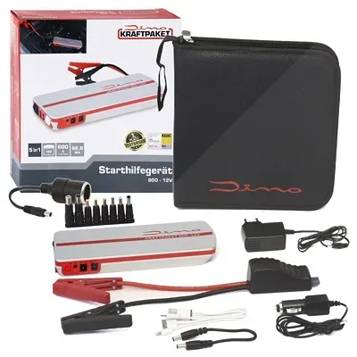 Dino KRAFTPAKET - EAN: 4003342173902 - Das Kraftpaket mit bärenstarken 18 Ah Kapazität & 600 A Spitzenstrom zum Starten aller Dieselmotoren bis 7.5 L & Benziner bis 8 L Hubraum. Integrierte Powerbank zum Aufladen von u.a. Kameras, Laptops, Mobiltelefonen, Notebooks, Navigationsgeräten, Smartphones, mobile Spielekonsolen, Tablets und zum Betreiben von 12-Volt-Autozubehör mit Netzteil wie Luftkompressoren oder Kühlboxen. Der umfangreiche Lieferumfang besteht aus Starthilfekabel, Ladekabel & Adapterset und sind gemeinsam mit dem Gerät in einer verschließbaren Tasche verpackt. Um einen fehlerhaften Anschluss zu vermeiden, bietet die Dino Starthilfe eine Sicherheitstechnologie mit Verpolungsschutz, Tiefenentladeschutz, überladeschutz, Unterspannungswarnung und & intelligentem Starthilfekabel. Die integrierte LED-Lampe mit drei Funktionen lässt Sie dabei nicht im Dunkeln stehen. Das Kraftpaket ist ideal für Anwender die nur ein Gerät für alle Motorengrößen benötigen und damit eine Vielzahl an elektrischen Geräten aufladen und betreiben können. - bei voelkner.de - aus Yadore Produktdaten ![]() ![]() DINO BIKES Dino Kraftpaket Multifunktionsstarthilfe & Powerbank - 18000 mAh [Hersteller-Nr. 136102]