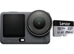 Sonstige Kameras Lifestyle Technik Foto Camcorder Digitalkameras - - Der Osmo Action 6 vereint eine innovative variable Blende mit einem brandneuen 1/1,1-Zoll-Quadratsensor, um die DJI-Flaggschiff-Bildgebung neu zu definieren und mehr Möglichkeiten für kreative Aufnahmen zu eröffnen., Kamerafunktionen: Empfindlichkeit ISO-Einstellung: 100 bis 51200, Verschlusszeit: 1/8000 bis 30, Anzahl Serienbilder pro Sekunde: 10 BpS, Aufnahmefunktionen: Autofokus, Belichtungskorrektur, Gesichtserkennung, Intervallaufnahme, Nachtaufnahme Funktion, Serienbildfunktion, Sprachbefehle, Video + Foto, Videostabilisierung, Zeitlupe, Zeitraffer, Aufnahmemodi: High-Speed-Modus, Nacht-Modus, Outdoor-Modus, Video+Foto, Seitenverhältnis: 4: 3, Typ Sensor: CMOS, Aufnahmeformate Foto: JPEG, RAW, Auflösung Foto in Megapixel: 38, Auflösung Foto in Pixel: 7168 x 5376, Objektiv: Lichtstärke maximal: f2,0, Bauart Objektiv: eingebaut, Bildschirm: Anzahl Bildschirme: 2, Bildschirmdiagonale in Zoll: 2,5 ″, Bildschirmdiagonale Bildschirm 2 in Zoll: 1,46, Bildschirmdiagonale in Zentimeter: 6,35 cm, Bildschirmdiagonale Bildschirm 2 in Zentimeter: 3,7 cm, Bildschirmtechnologie: Touch, Videofunktionen: Auflösungsstandard Video: 4K Ultra HD, Auflösung Video in Pixel: 3840 x 3840, Aufnahmeformate Video: MP4, Anschlüsse: Typ Anschluss: Card Reader, USB-C, Anzahl USB-Anschlüsse: 1, Typ USB-Anschluss: USB-C, Netzwerk- und Verbindungsarten: Netzwerkstandard: Bluetooth, Bluetooth-Version: 5.1 BLE, Wi-Fi-Standard: a, b, ... Dieses Bundle enthält die Standard Combo und eine 256GB MicroSDXC-Karte, was ein hervorragendes Preis-Leistungs-Verhältnis für sofortige Nutzung bietet. ![]() DJI Osmo Action 6 Standard Combo + Lexar Silver Plus MicroSDXC 256GB