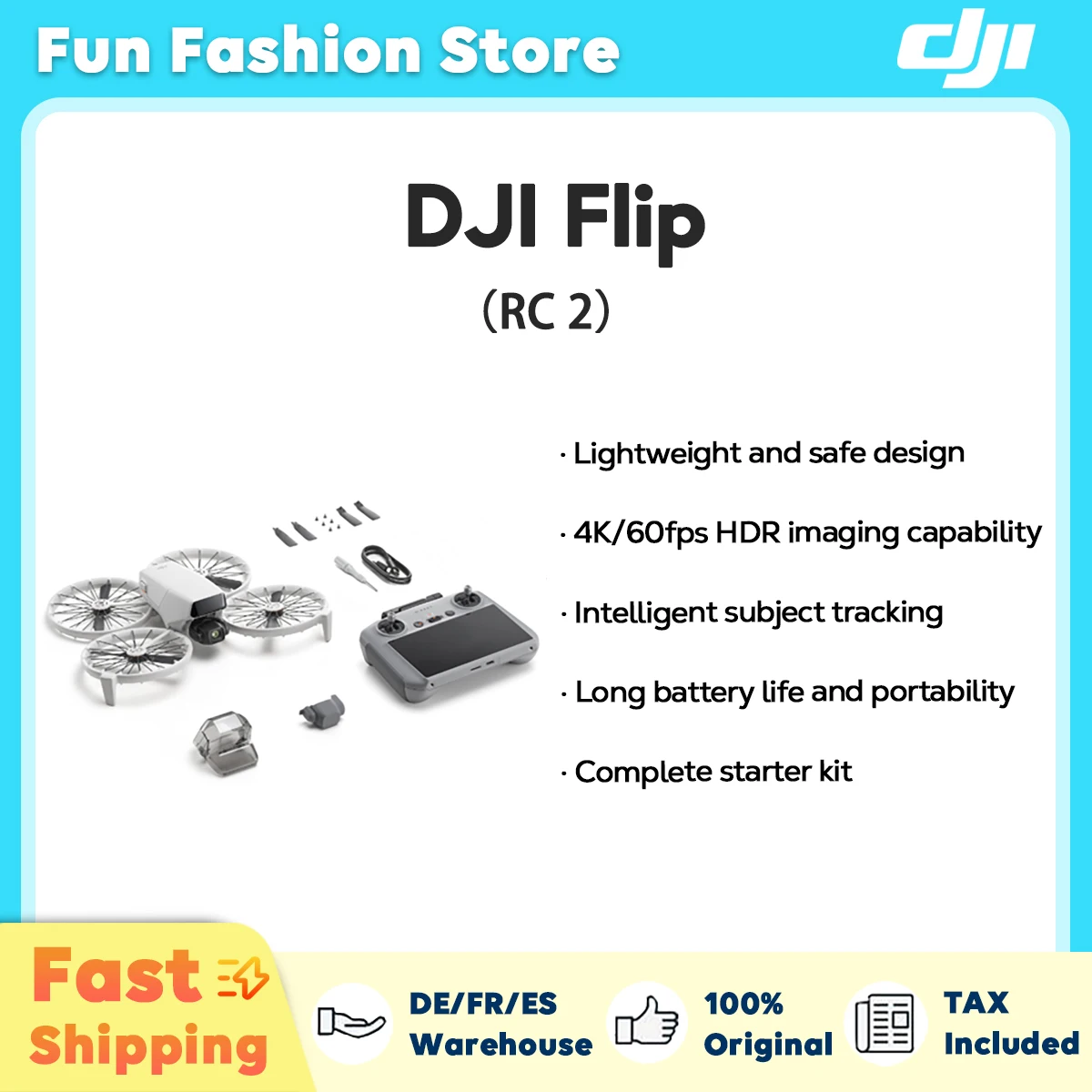DJI - DJI Flip-Drohnenkamera (RC-2), 4K, leichte 3-Achsen-Gepäckbodenstabilisierung, 13 km Videoübertragung, Handflächenabnahme, automatische Rückgabe, C0 - bei de.aliexpress.com - aus Yadore Produktdaten ![]() ![]() DJI Flip - mit RC eBay 2 neuwertiger Rückläufer, 2 Jahre Garantie